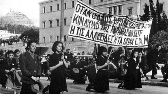 4 Aralık 1944’te bir gün önce katledilen insanlar için aynı yerde bir protesto gösterisi daha düzenlenir. O gün aynı zamanda cenaze merasimi de yapıldığı için insanlar siyah giymişlerdir. Resim 2’deki fotoğraf o güne ait en çarpıcı fotoğraflardan biri. Siyahlar içindeki genç kızların taşıdığı pankart ülkedeki otoriter rejime karşı duruşun yolunun silahlanmaktan geçtiğini ifade etmektedir.