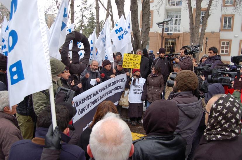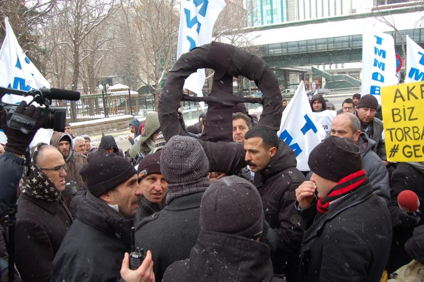 TMMOB üyeleri, AKP’nin TMMOB Yasası’nda değişiklikleri de içeren torba yasayı, il koordinasyon kurullarının bulunduğu tüm kentlerde Çevre ve Şehircilik Bakanlığı ile müdürlükleri önüne siyah çelenk koyarak protesto etti. Ankara’da bakanlık önünde yapılan basın açıklamasını TMMOB Yönetim Kurulu Başkanı Mehmet Soğancı okudu.