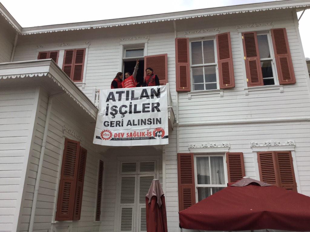 Protesters set up camp in front of the hospital last December to demand the reinstatement of 98 workers dismissed for demanding higher wages and shorter working hours, and for joining Dev Sağlık-İş – the health union of the progressive labour confederation, DISK.