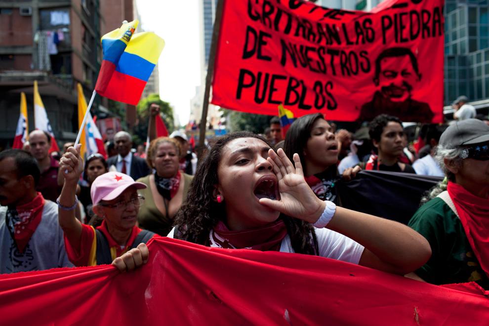 “Venezüella’da protestocuların yanı sıra hükümet yanlısı on binler de sokaklarda. Halk komiteleri “Colectivos” (“Kolektifler”) Chavez’in resimleriyle eylemde. “