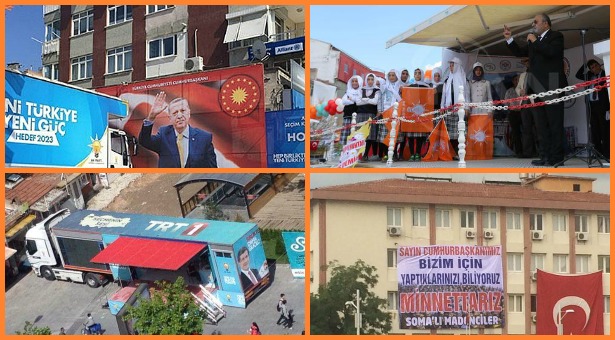 During the campaign, public buildings and municipalities were decorated with AKP banners, mosques became AKP campaign centers and PTT cargo vehicles became de facto AKP campaign vehicles. In Niğde’s Hükümet Square, it emerged that the AKP’s campaign truck actually belonged to state broadcaster TRT-1. In Manisa, a banner was hung expressing greetings from Soma miners to Erdoğan, despite the deaths of 301 miners the previous year in an “accident” that stemmed from the AKP’s mining policies.