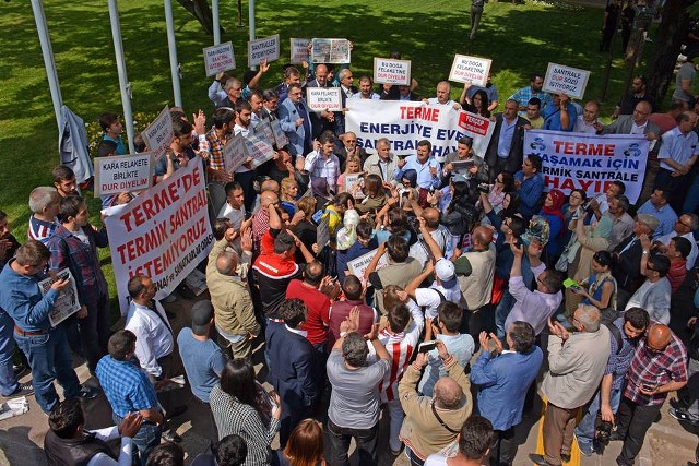 Termik santral için Çevre ve Şehircilik Bakanlığı’nda Çevresel Etki Değerlendirme Müdürlüğü’nde düzenlenen komisyon toplantısına Terme Belediye Başkanı Şenol Kul’un yanı sıra Çevre ve Şehircilik İl Müdürlüğü, Gıda Tarım ve Hayvancılık İl Müdürlüğü, İl Afet ve Acil Durum Müdürlüğü, Halk Sağlığı Müdürlüğü ve Kültür Varlıklarını Koruma Bölge Kurulu Müdürlüğü yetkilileri ve ilçe halkı katıldı. Komisyon toplantısı öncesinde Bakanlık önünde ve Ankara Güven Park’ta toplanan ilçe halkı seslerini duyurmak için eylem yaptılar.