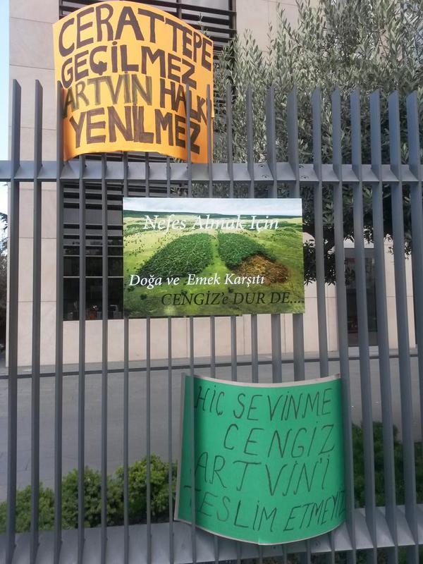 Holding binası önünde Yeşil Artvin Derneği adına okunan basın açıklamasında önce süreçle ilgili bilgi verildi; iptal edilen ÇED raporuna, mahkemenin iptal gerekçesinde “Maden olursa Artvin biter” kararına rağmen şirketin birkaç değişiklikle yeni bir ÇED için onay aldığı ve buna dayanarak yeni bir saldırıya geçtiği anlatıldı. Şirketin yer tespiti yapacağını öğrenen Artvin halkının haber alır almaz Cerattepe’ye çıkarak iş makinelerini engellediği, nöbete başladığı bilgisi verildi. Sık sık “Artvin halkı yenilmez, Cerattepe geçilmez”, “Katil şirket Artvin’i terk et”, “Diren Artvin İstanbul seninle” sloganları ile kesilen açıklamada Artvin Valiliği’nin İstanbul ve Ankara’da düzenlediği Artvin Tanıtım Günleri için ‘bağış’ adı altında şirketten 104 bin lira almasına da tepki gösterildi.