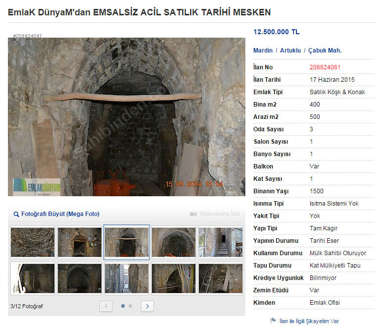 Mardin’deki Mor Yuhanna Süryani Kilisesi’ne, bir emlak komisyoncusunun aracılığıyla, Sahibinden.com sitesi üzerinden 12.5 milyon liraya ‘müşteri’ aranıyor… İlandaki “Kat Mülkiyetli Tapu” ibaresi dikkat çekiyor. İlanı verenler ‘ilgiyi artırmak ve pazarlıkta koz yükseltmek’ gibi düşüncelerle olsa gerek, kilisenin tarihi özelliklerini ilana da yazmışlar… Aynen şöyle deniyor ilanda: “Mardin’de yıllardır depo olarak kullanılan ve 5’inci yüzyılda inşa edildiği tahmin edilen yapının kilise olduğu belirlendi. (…) Burada patriklere ait mezarlar var.”