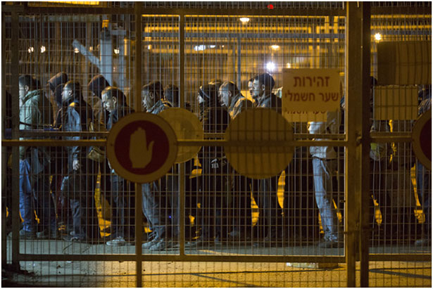 İsrail’de her gün görülebilecek bir manzara: İşgal altındaki Batı Şeria’’nın Tulkarim kenti yakınında yer alan Shaar Efraim kontrol noktasında işlerine gitmek üzere geçiş için bekleyen Filistinli işçiler, 22 Aralık 2014, Oren Ziv, ActiveStills.