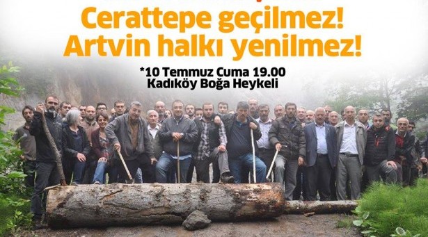 Artvin Cerattepe’de Cengiz Holding’in yapmak istediği madene karşı Artvin halkının direnişi devam ediyor. Şirketin jandara eşliğinde 9 Temmuz’da direnişe saldırmasının ardından İstanbul’dan dayanışma eylemi çağırısı geldi. Yaşam savunucuları herkesi bugün (10 Temmuz) Kadıköy’e çağırıyor. Cengiz Holding’in maden sahasına yönelik saldırısını püskürten Artvin halkı nöbete devam ediyor. Yaşam savunucuları 10 Temmuz 19.00’da Kadıköy Boğa Heykeli’nde buluşuyor.