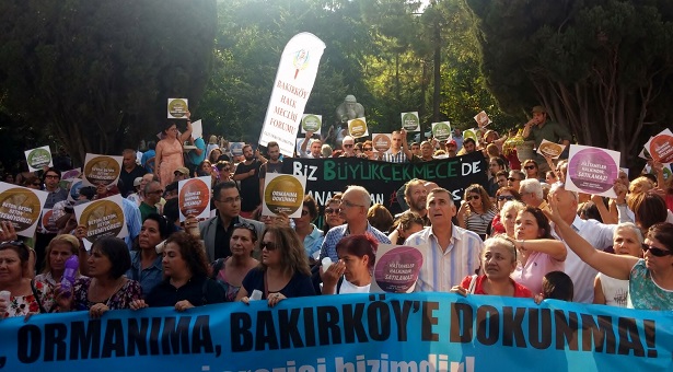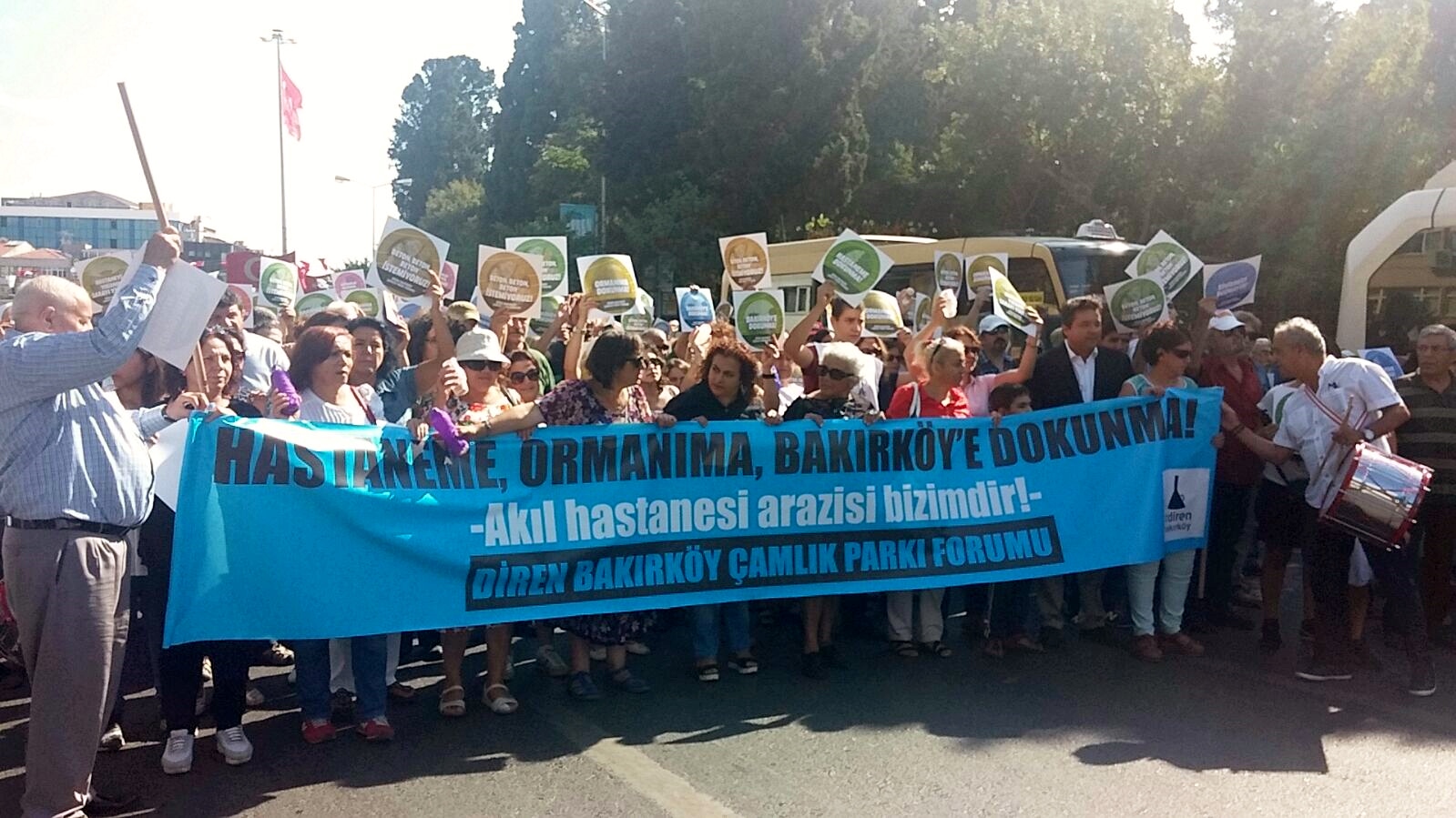 Diren Bakırköy Çamlık Parkı Forumu’nun çağrısıyla bir araya gelen yaşam savunucuları, Bakırköy Prof. Dr. Mazhar Osman Ruh ve Sinir Hastalıkları Hastanesi’nin rant uğruna yıkılmasına karşı bugün eylemdeydi