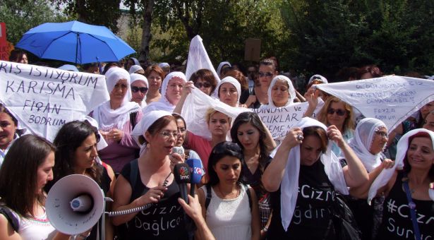 Women then started writing their own messages on the white scarfs that they had brought to the Turkish Grand National Assembly. Singing songs of peace and solidarity they continued their action of solidarity despite a downpour of rain. Police did not allow them to tie the scarfs on the gates of the National Assembly.