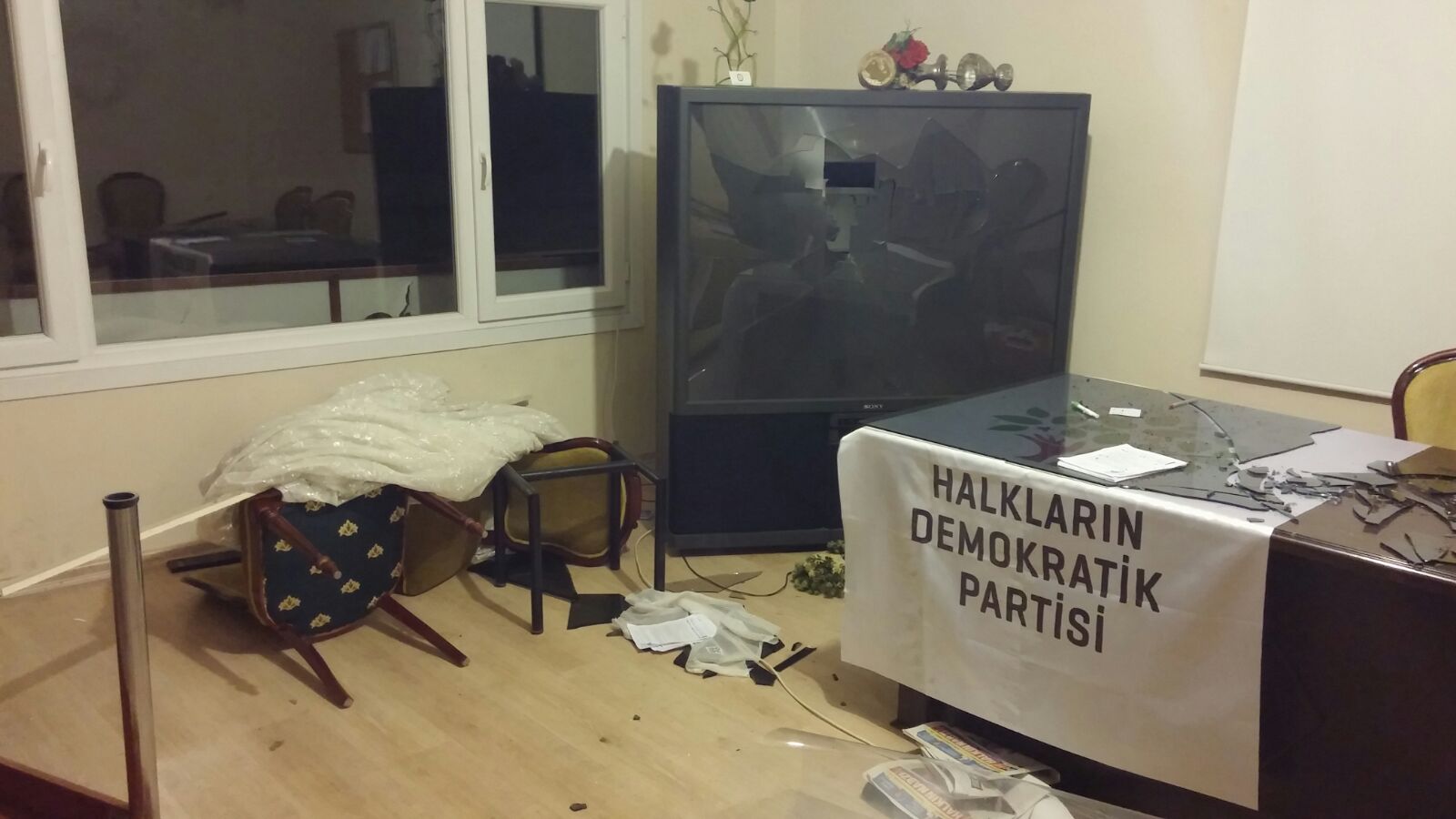 Ümraniye’de HDP binası önünde toplanan faşist kalabalık, tekbir getirerek parti binasına saldırdı. Binanın camlarını kıran faşist güruh, binanın üst katında yer alan DBP Siyaset Akademisi talebasını parçaladı, binaya Türkiye bayrağı astı.