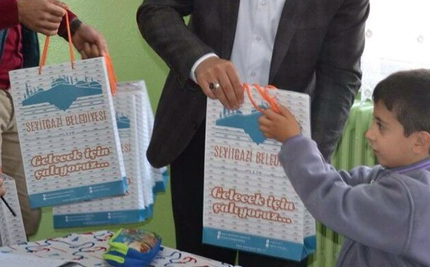 Eskişehir’de AKP’li Seyitgazi Belediye Başkanı Hasan Kalın okullarda öğrencilere dağıttığı kırtasiye setlerinin konulduğu çantalara “Gelecek İçin Çalıyoruz” yazdı
