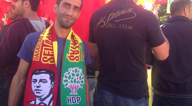 yoldan sonra biz de garda indik, uzun bir tuvalet kuyruğu vardı, herkes ülkenin başka bir yerinden gelmiş. meydanda, kimisini uzun zamandır görmediğimiz tanıdıklarla selamlaştık, alana yerleştik. saat henüz on olmamasına ve ankaralılar yeni yeni gelmeye başlamasına rağmen -hep öyle olur ya, ev sahibi daha geç varır alana- miting kalabalıktı, birkaç fotoğraf çektim, sonuncusu, yukarıda gördüğünüz, kemal atatürk tişörtlü çocukla demirtaş atkılı çocuğun fotoğrafı.