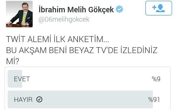 Ankara Büyükşehir Belediye Başkanı Melih Gökçek twitterda kendine yeni bir uğraş buldu. Twitter’da başlattığı anketlerde ilk sorduğu soru “Bu akşam beni Beyaz TV’de izlediniz mi?” olurken ardından gelen soru Ankara ve Suruç Katliamları’yla ilgili oldu.