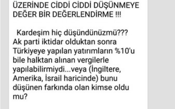 Çanakkaleolay.com’un haberine göre; öğretmenin yazdığı mesajda, Erdoğan’ın yerinin doldurulamayacağı belirtilerek, “Gezi olayları, 17-25 Aralık operasyonları, Mit tırlarına yapılan operasyonlar hep bu sebepten idi. Asıl konumuza dönersek, Gezi olaylarında dolar 2 TL’yi görmeyecek diyen merkez bankası her gün piyasaya 1 milyar dolar sürüyor, bu da ABD ve İngiltere’yi çıldırtıyordu. Hangi paraydı bu piyasaya sürülen para? Merkez Bankasında dolar limitinin tükenmiş olması gerekiyordu. Doların en az 5 TL ye fırlamış olması gerekiyordu. Ama olmuyordu işte. Bu paralar, Yasin El Kadı gibi bir kaç Arap iş adamının parasıydı. Ve Yasin El Kadı sırf bu yüzden Türkiye’ye geldiğinde bir kaç kere suikaste uğradı. Bütün bu detayları devlet açıklayamaz. Bu durumu en iyi bilenlerden biride paralel yapı olduğu için, Tayyip Erdoğan’ın milyar dolar çaldığını tapelerle isbata kalktılar. Çok iyi biliyorlardı ki, yapılan yatırımlardan bırakın rüşvet alıp para çalmayı, mevcut gelir ile yatırımların %10`nu bile yapmak mümkün değildi. Devletin kasasına gelen para belli, kasadan çıkacak olan para da belli. Kullanılan para miktarı öyle 1 Milyar dolar filan da değil. Bu para devletin geliri değil, aksine devlete Recep Tayyip Erdoğan’ın kendi itibarı ile kattığı ek gelirdir. Bu paralar bu güne dek milletin çıkarları için kullanılmıştır ve bundan sonra da bu çıkarlar doğrultusunda kullanılacaktır. Sayın Cumhurbaşkanımızı ve bu ülkeyi İngiliz, Amerikan, Yahudi uşaklarına yem etmeyelim. 100 tane de kaset çıksa bilin ki Recep Tayyip Erdoğan bir hırsız değil aksine bu ülkeye dışardan para getirmiş kaybetmeye tahammülümüzün olmayacağı, yerini asla kimsenin dolduramayacağı tek liderdir. Gelecek nesiller için sahip çıkalım. Bu metni şu anda yurdun dört bir köşesine yaymak için harekete geçtik. Senin de yardımına ihtiyacımız var. Okuyalım ve yayalım inşallah” ifadeleri kullanıldığı iddia ediliyor.