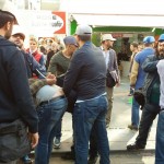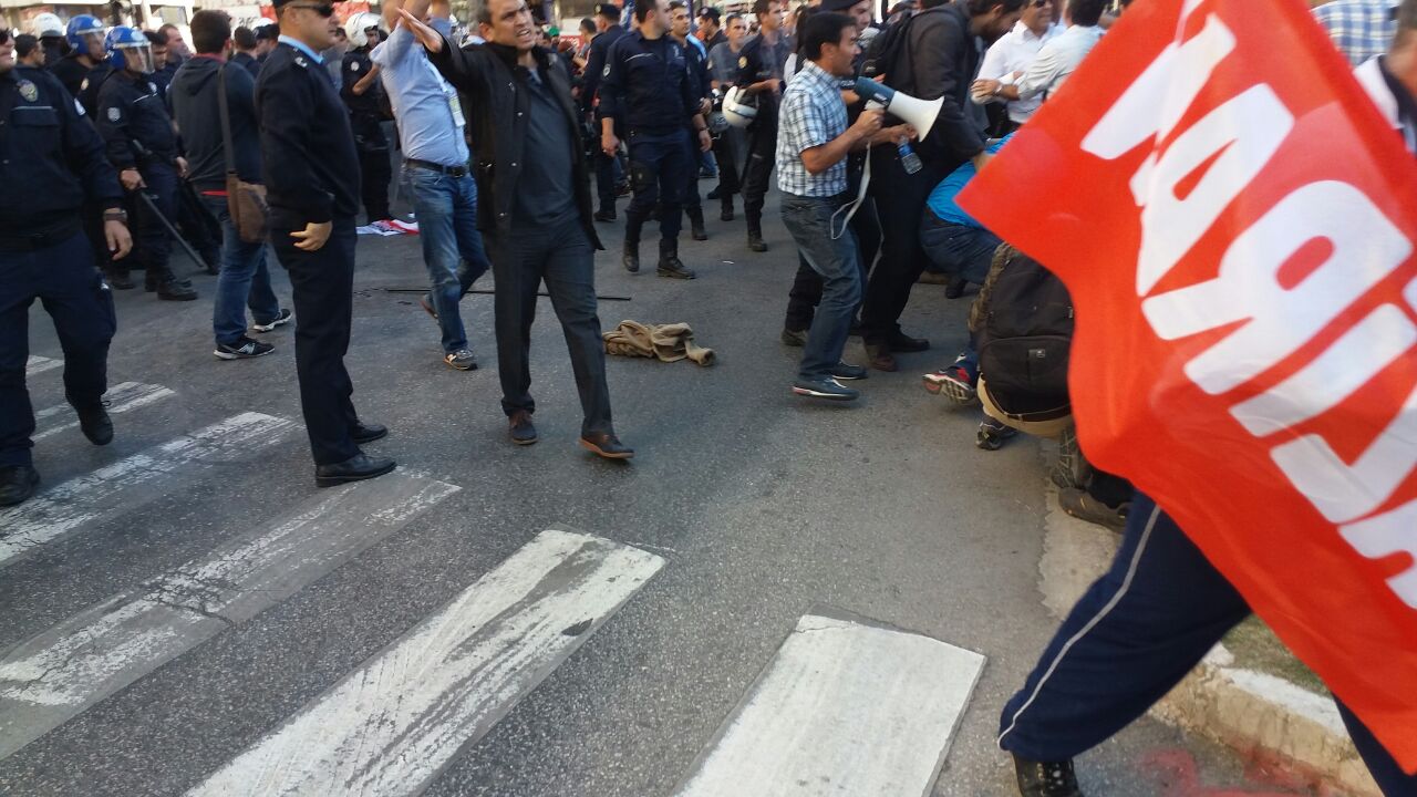 Faced with the police barricade on the way to Cumhuriyet Square, members of the Halkevleri, Öğrenci Kolektifleri and Liseli Genç Umut told police, “We are exercising our right to protest, and we have no guns. But if you hinder us, we will use our right to resist. You can’t force revolutionaries into cages in Cumhuriyet Square,” before overcoming the barricades and continuing their march.