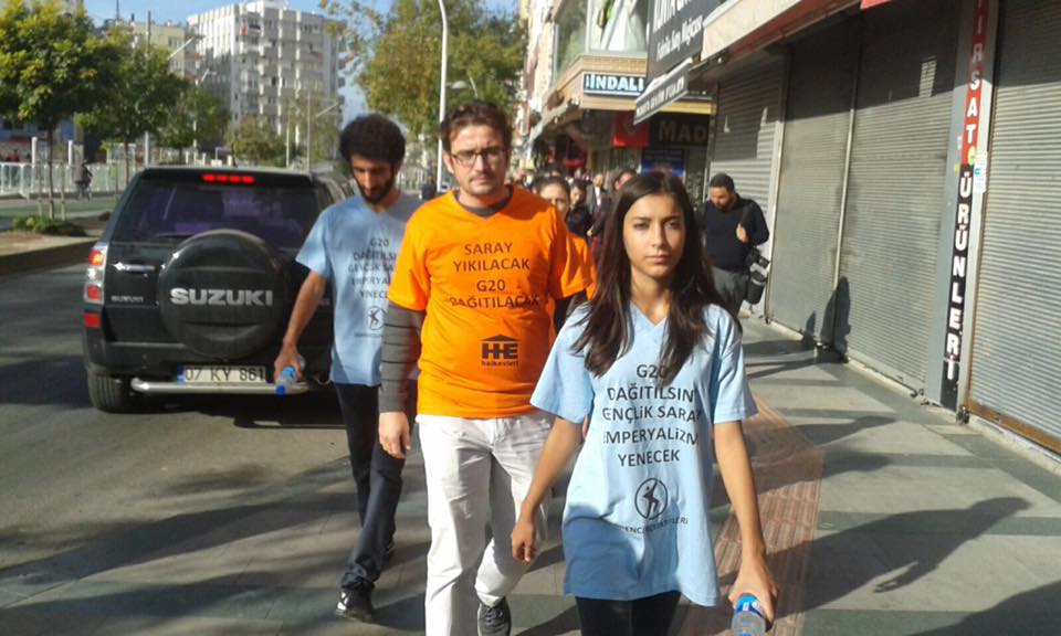 Antalya’da düzenlenen G20 zirvesine mektup götürmek için Attalos Meydanı’ndan yola çıkan Halkevleri ve Öğrenci Kolektifleri’nden 4 kişi Valilik kararıyla yasaklanan bölgeye dahi gelmeden gözaltına alındı.