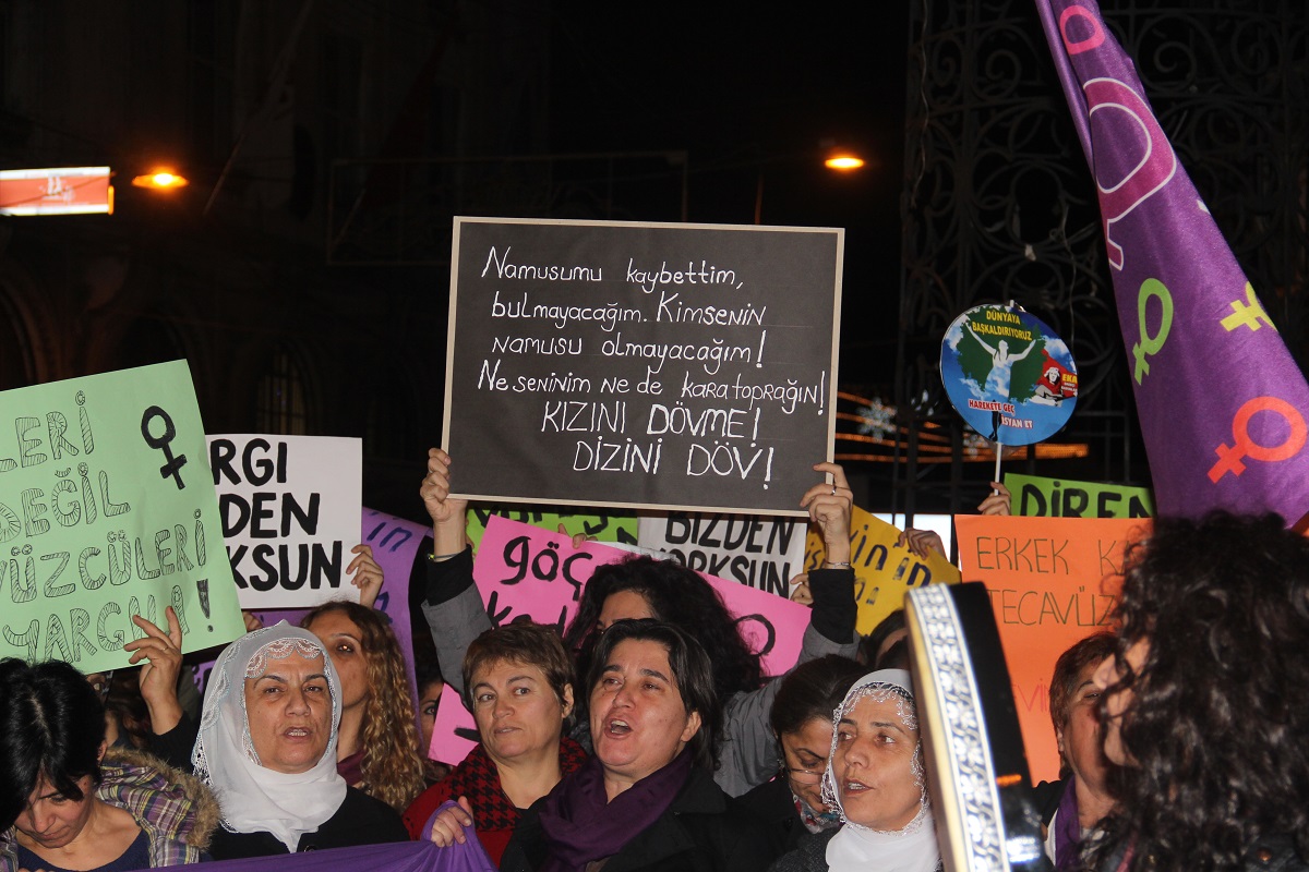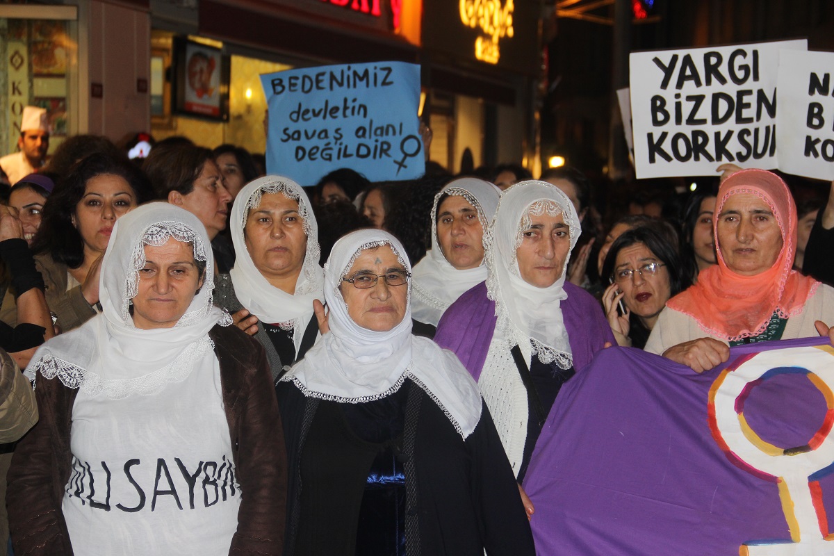 Eylemde, hayatta kalmak için şiddet gördükleri erkekleri öldüren kadınlara dikkat çekilirken; Diyarbakır, Suruç, Ankara, Beyrut ve Paris’teki katliamlar, Silvan’daki ırkçı yazılamalar, IŞİD çetelerinin saldırıları, devletin inkar ve imha politikalarına da tepki yükseldi, kadınlar, “Bizler savaş-erkeklik ve devlet ilişkisini çok yakından tanıyoruz” dedi.