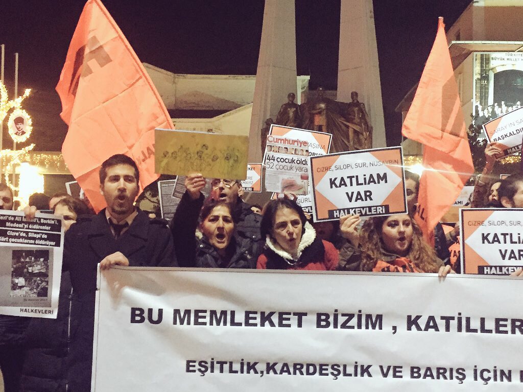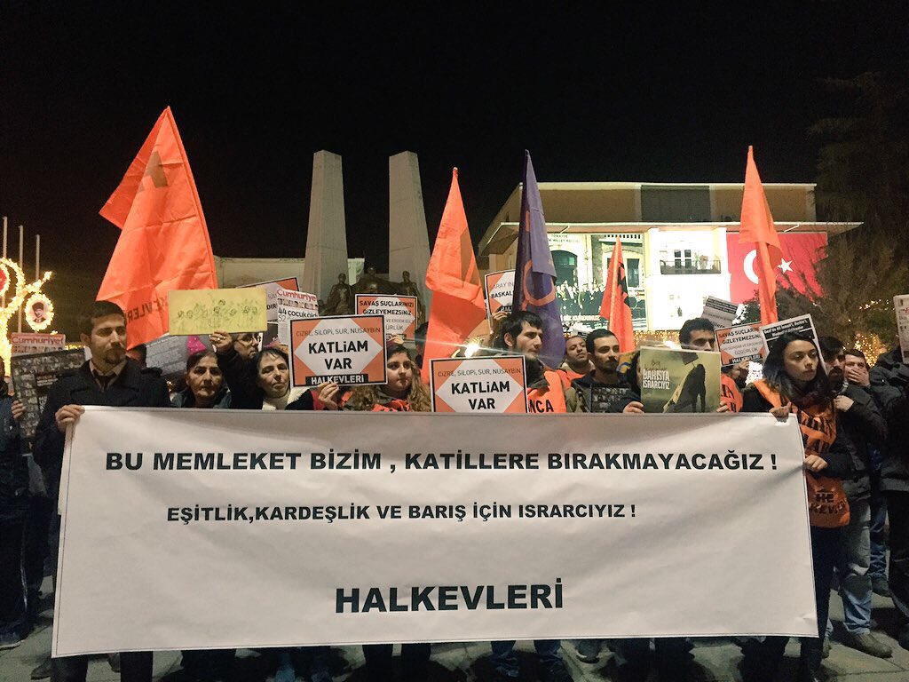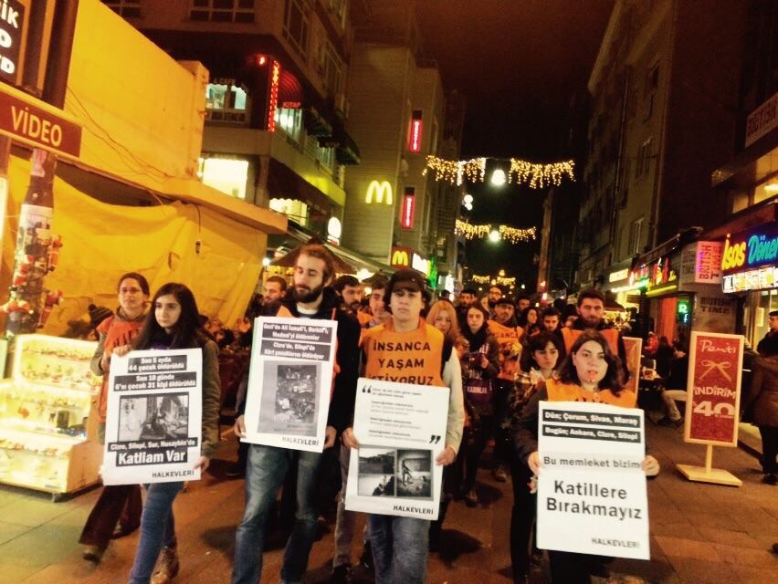 İstanbul’da Halkevleri’nin çağrısıyla Beşiktaş ve Bakırköy’de bir araya gelenler AKP’nin Kürt illerindeki savaş politikalarına karşı sokağa çıktı. Kürt illerinde süren sokağa çıkma yasakları, asker ve polisin halka yönelik saldırıları, katliamlara karşı Fırat’ın batısı ve doğusunu birlikte direnmeye çağıran Halkevleri Beşiktaş’ta yaptığı savaşa karşı ses çıkarma eylemi ve Bakırköy’deki basın açıklamasıyla “Memleketi katillere bırakma” dedi.
