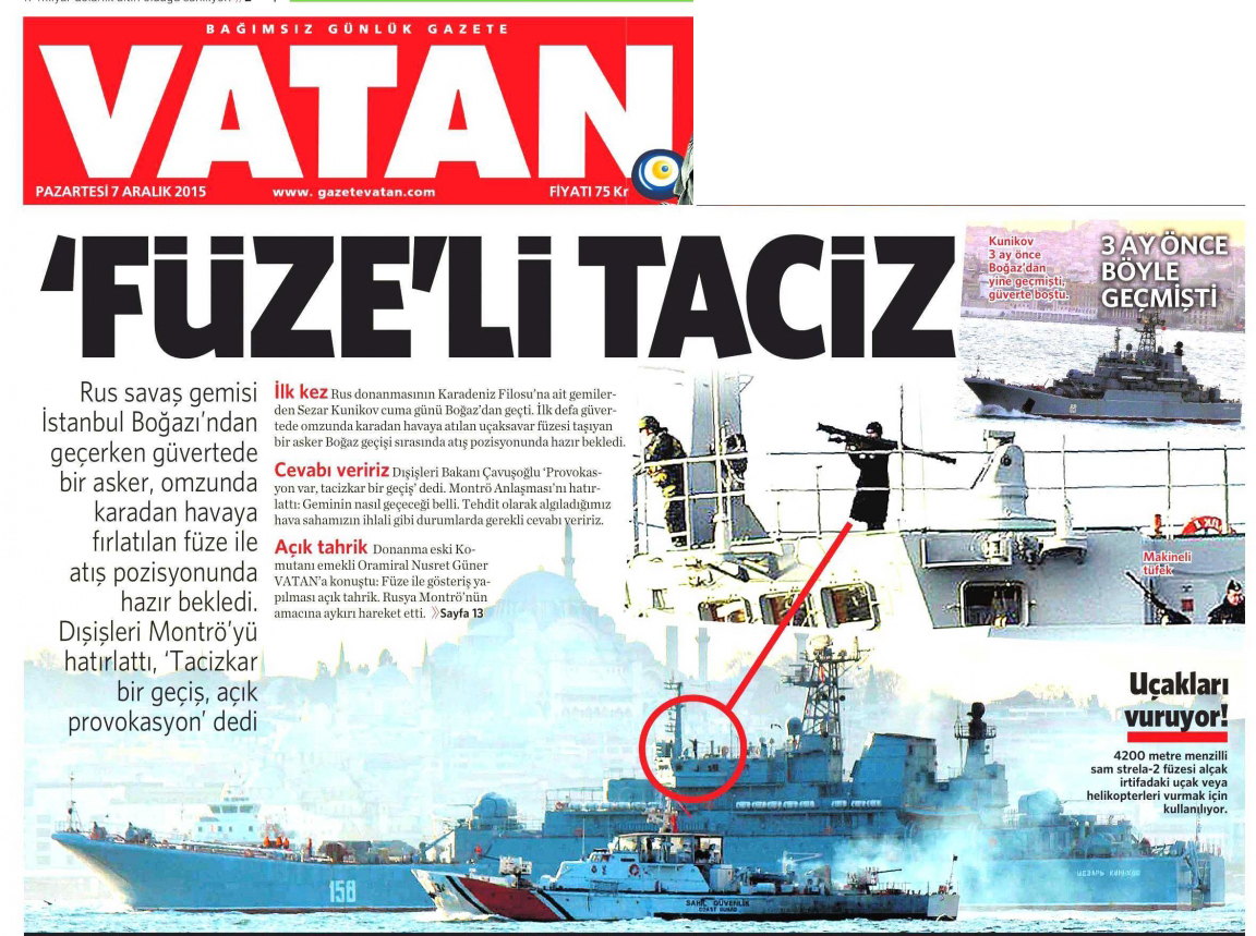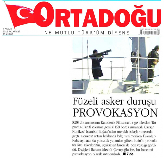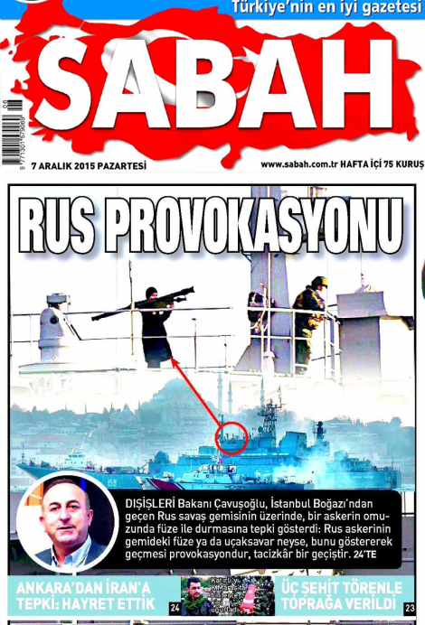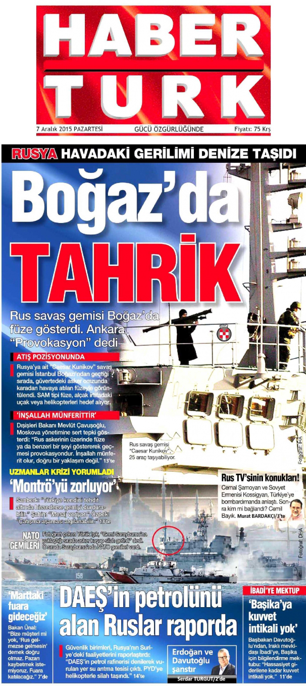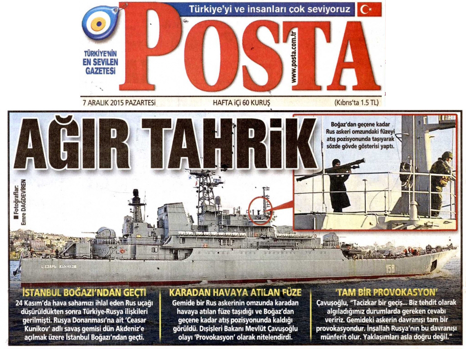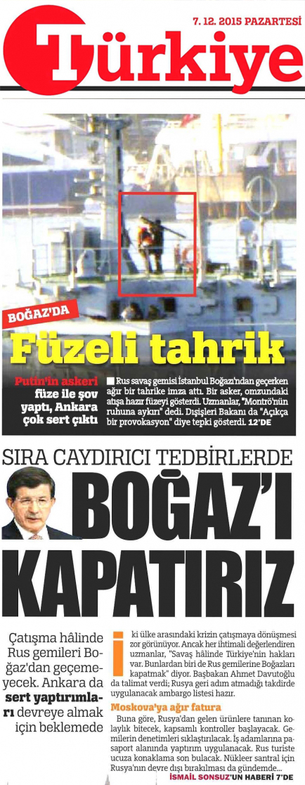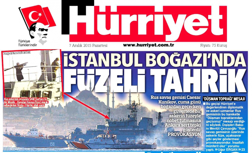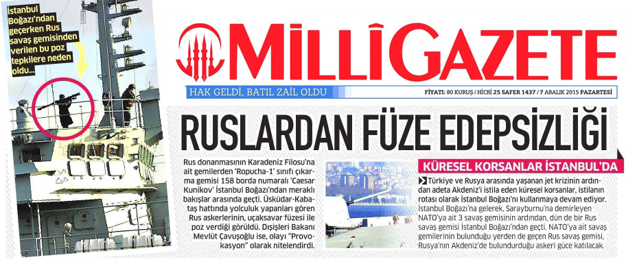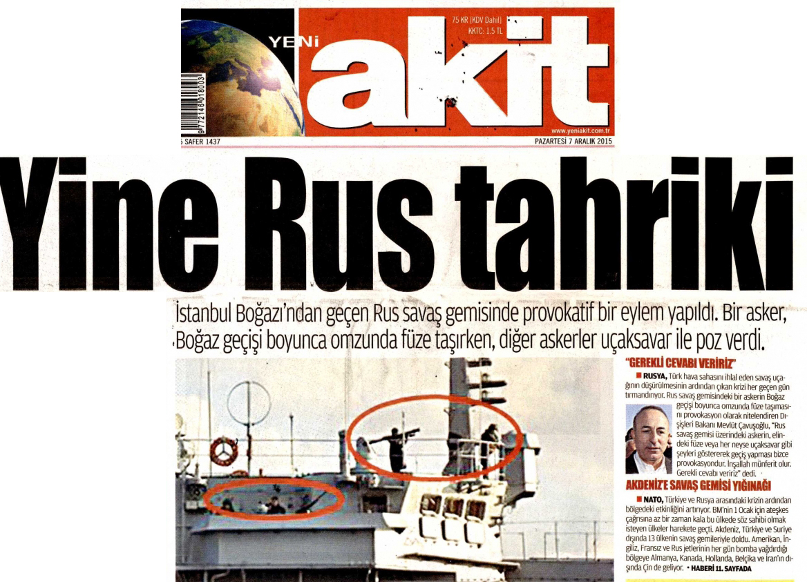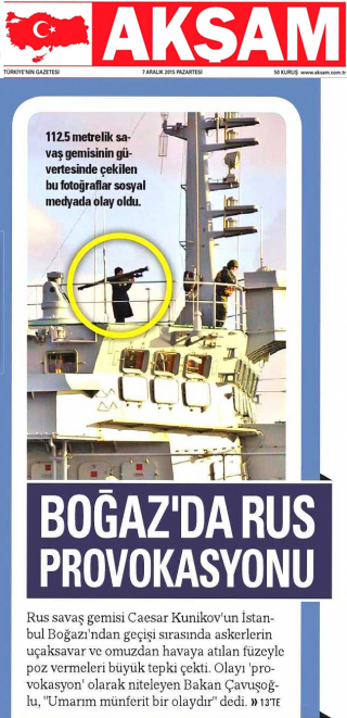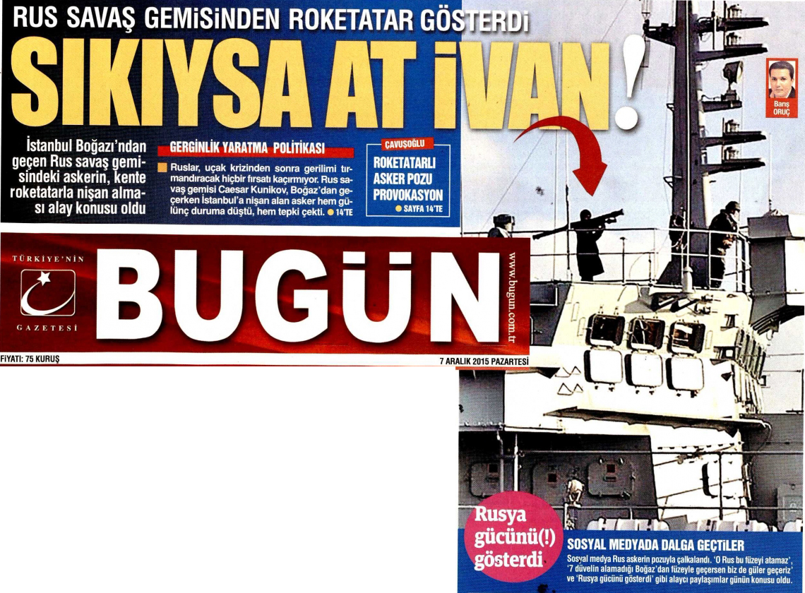 Musul propagandasının ömrü kısa sürünce bu defa üç gün öncenin (4 Aralık Cuma) gelişmesi ısıtılıp sunuldu. Savaş medyasının manşetlerinde Ceasar Kunikov adlı Rusya savaş gemisinin boğazdan geçişi sırasında gemideki bir askerin omzundaki füzeyle atış pozisyonunda olduğu anın kareleri aldı.