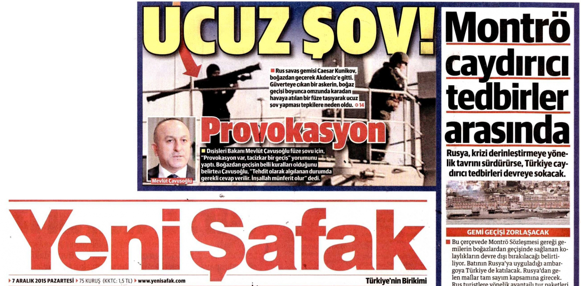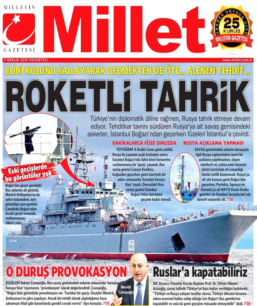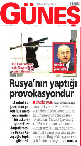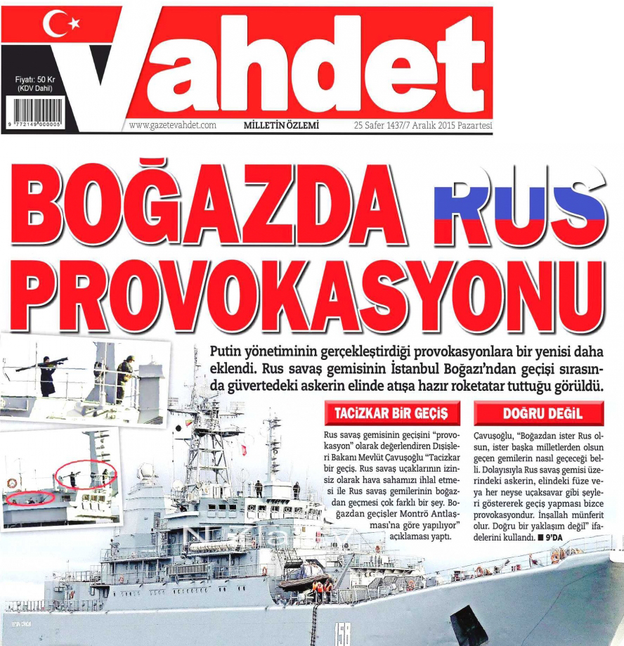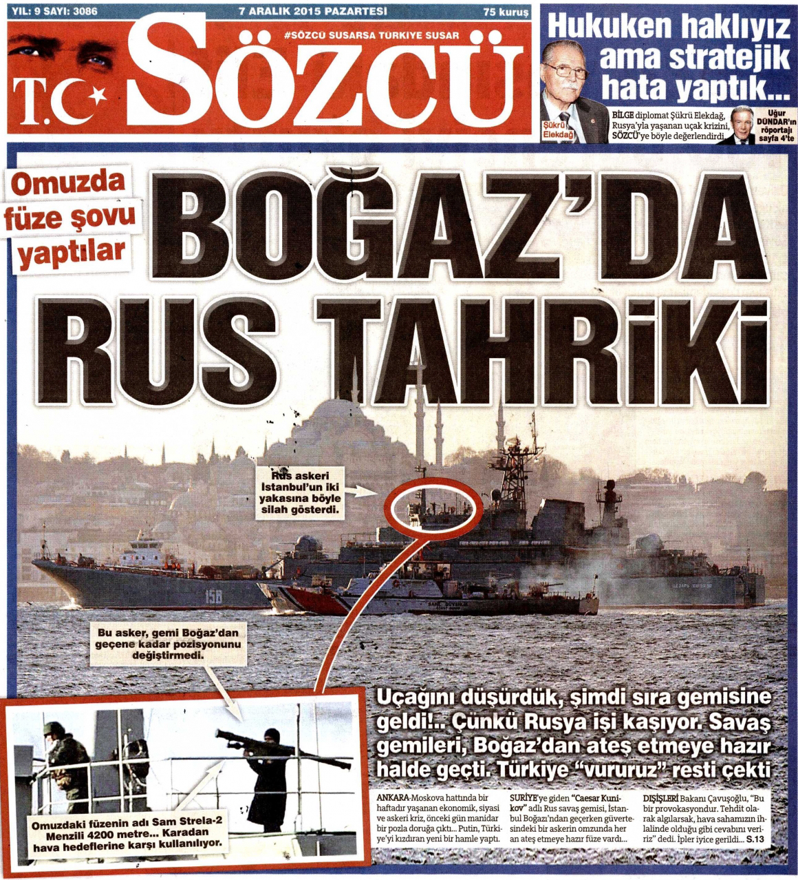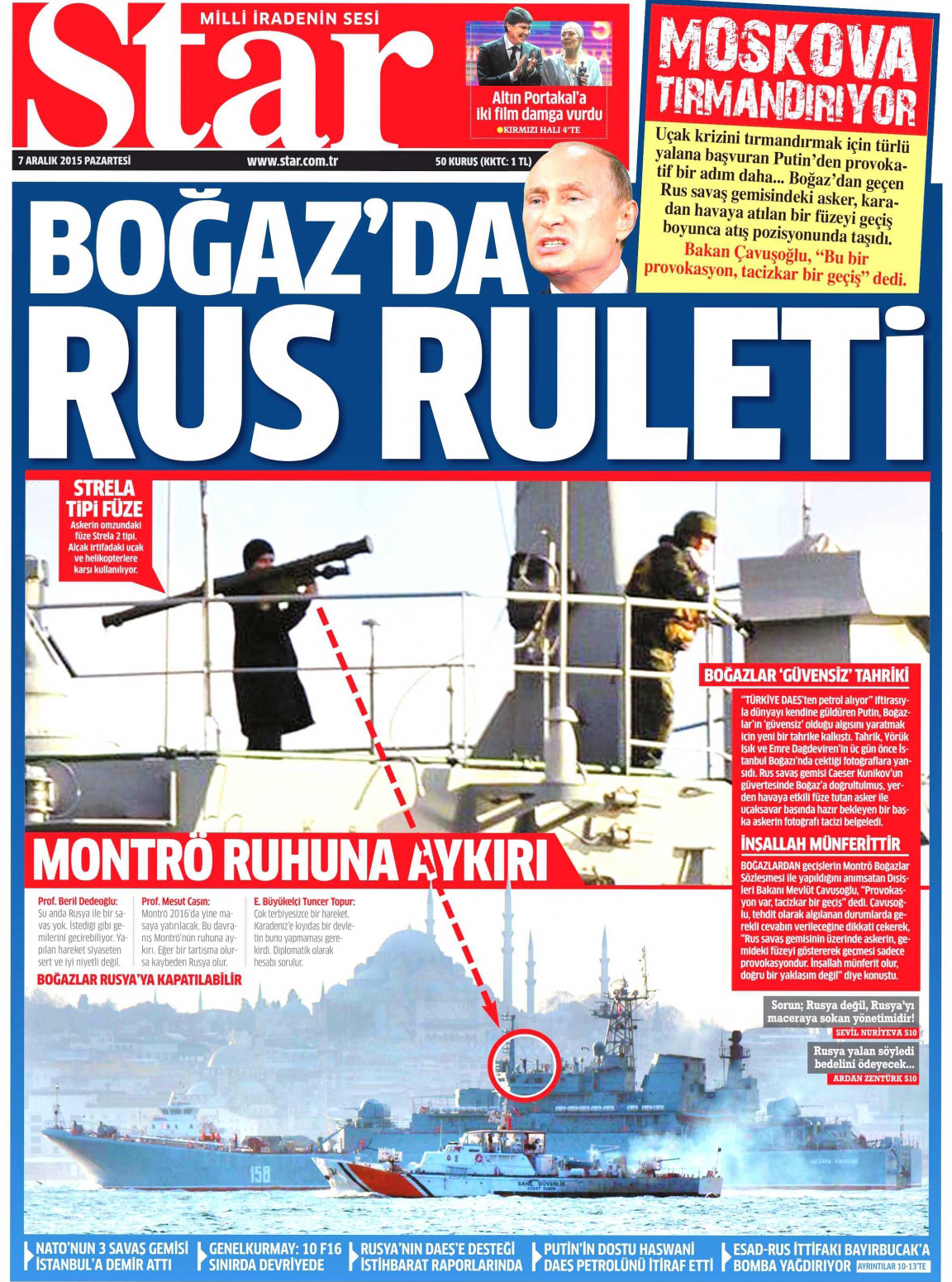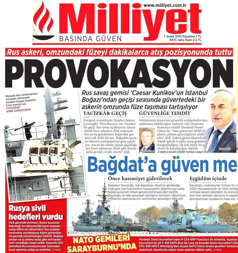 Musul propagandasının ömrü kısa sürünce bu defa üç gün öncenin (4 Aralık Cuma) gelişmesi ısıtılıp sunuldu. Savaş medyasının manşetlerinde Ceasar Kunikov adlı Rusya savaş gemisinin boğazdan geçişi sırasında gemideki bir askerin omzundaki füzeyle atış pozisyonunda olduğu anın kareleri aldı.