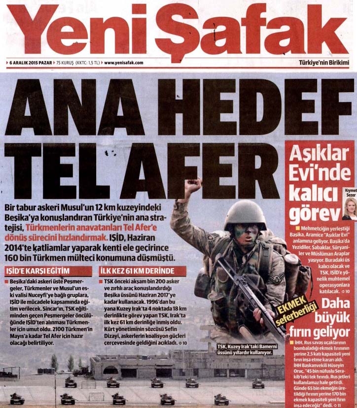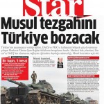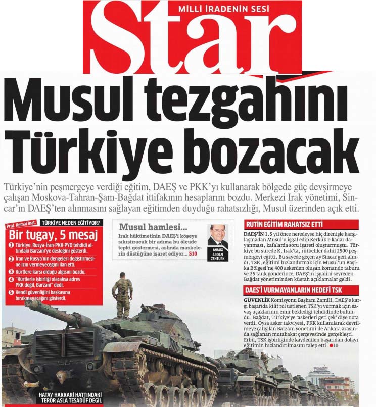 Star gazetesi “Musul tezgahını Türkiye bozacak” manşetiyle Türkiye’nin Rusya-İran-Irak-Suriye dörtlüsünün karşısına dikildiğini ve “kendi güvenliğini başkasına bırakmayacağı”nı iddia ederken, Yeni Şafak bu hamle ile “Türkmenlerin anavatanları Tel Afer’e dönüş sürecinin hızlanacağını” ileri sürdü.