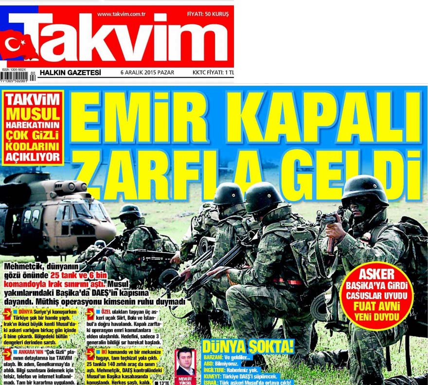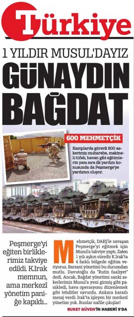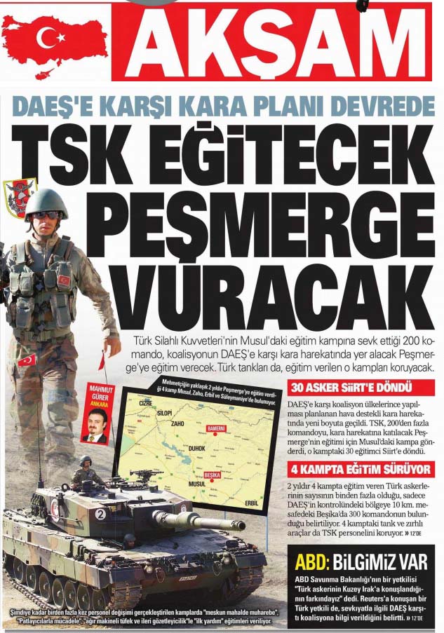 Akşam gazetesi “TSK eğitecek, peşmerge vuracak” manşeti atarken, Takvim gazetesi sınırları zorlayarak “Mehmetçik dünyanın gözü önünde 25 tank ve 6 bin komandoyla Irak sınırını aştı, DAEŞ’in kapısına dayandı, kimsenin ruhu duymadı” dedi. Türkiye gazetesi de Irak’a yönetimine “Günaydın Bağdat, 1 yıldır Musul’dayız” diye seslendi.