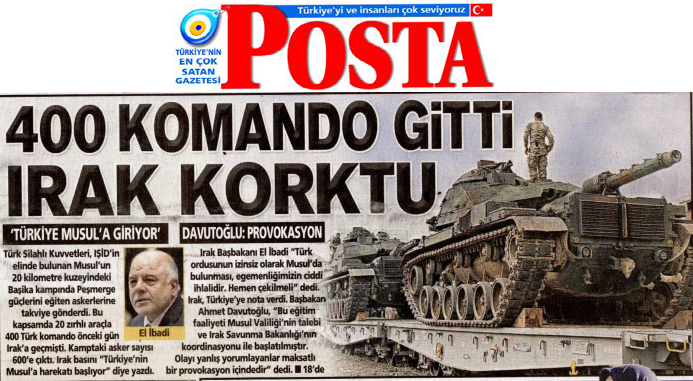 AKP ile arasıdaki buzları, içeride ve dışarıda yürütülen savaş politikalarına sunduğu destekle eritmeye çabalayan Doğan Medya da Saray-AKP medyasından geri kalmadı. Hürriyet, 600 asker gönderilerek toplam asker sayısının bin 600’e yükseldiğini, asker sayısının 2 bine yükselmesinin amaçlandığını öne sürdü. Posta da Ak trolleri aratmayan bir başlıkla haberi sundu: “400 komando gitti, Irak korktu.”