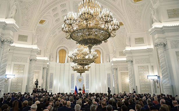 Rusya Devlet Başkanı Vladimir Putin, Kremlin Sarayı’nın Georgiyevskiy Salonu’nda Rusya parlamentosunun alt ve üst kanatları olan Federasyon Konseyi ile Duma’dan yaklaşık bin vekil ve 500’ün üzerinde yerli ve yabancı basın mensubuna hitap etti.