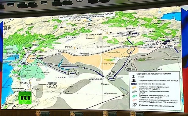 Rusya Savunma Bakanlığı Suriye’deki IŞİD militanlarının finansal kaynaklarına dair kanıtlar da sunacakları bir basın toplantısı düzenledi. Çeşitli görüntülerin kanıt olarak sunulduğu toplantıda IŞİD’in Suriye ve Irak’ta meşru sahiplerinden çaldığı petrolü Türkiye üzerinden üç ana güzergah kanalıyla pazarladığı ve Rusya’nın ellerindeki verilere göre bu ticarete Tayyip Erdoğan ve ailesinin de dahil olduğu belirtildi