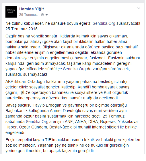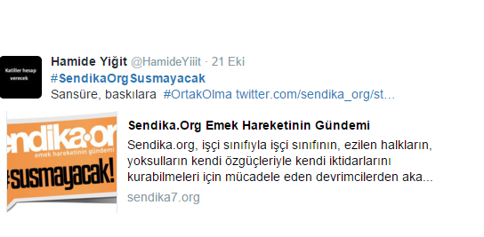 Sendika.Org olarak sitemizde yazılarına ve çevirilerine yer verdiğimiz Hamide Yiğit’in yanında olduğumuzun altını çizeriz. Katliamlarla, savaş suçlarıyla, yolsuzluklarla dolu sicili her geçen gün kabaran Saray ve AKP’nin baskıları ve gerçeklerin üzerini örtme çabası sonuç vermeyecek. Sendika.Org, Saray’ı ve AKP’yi rahatsız eden gerçeklerin açığa çıkarılması ve yaygınlaştırılması için bugüne kadar olduğu gibi bundan sonra da gerçeklerin peşini bırakmayacak.