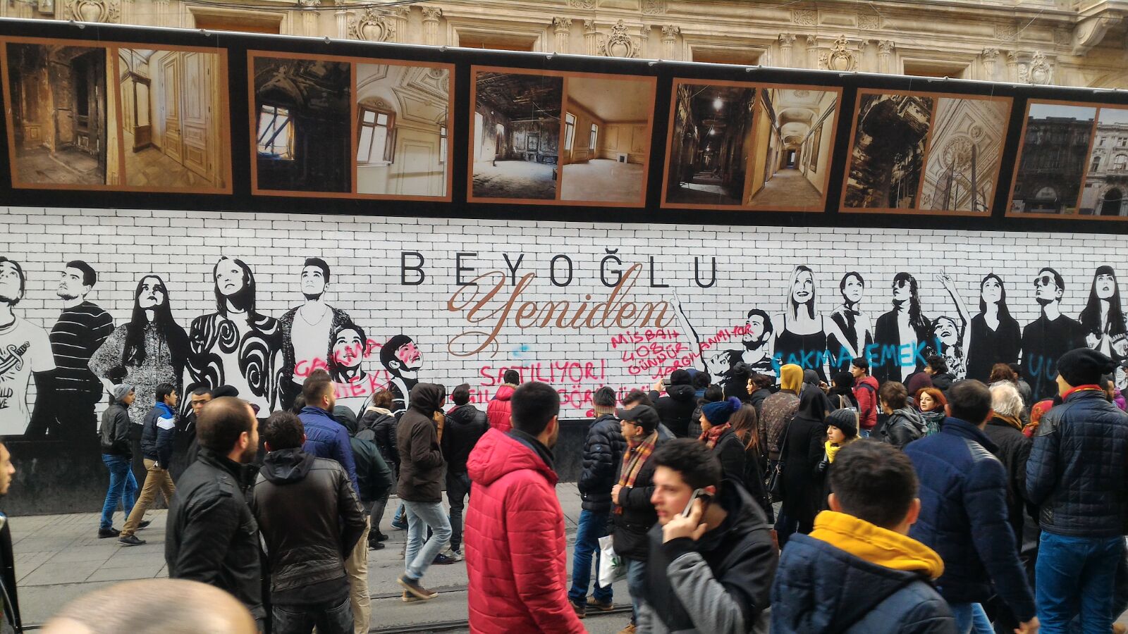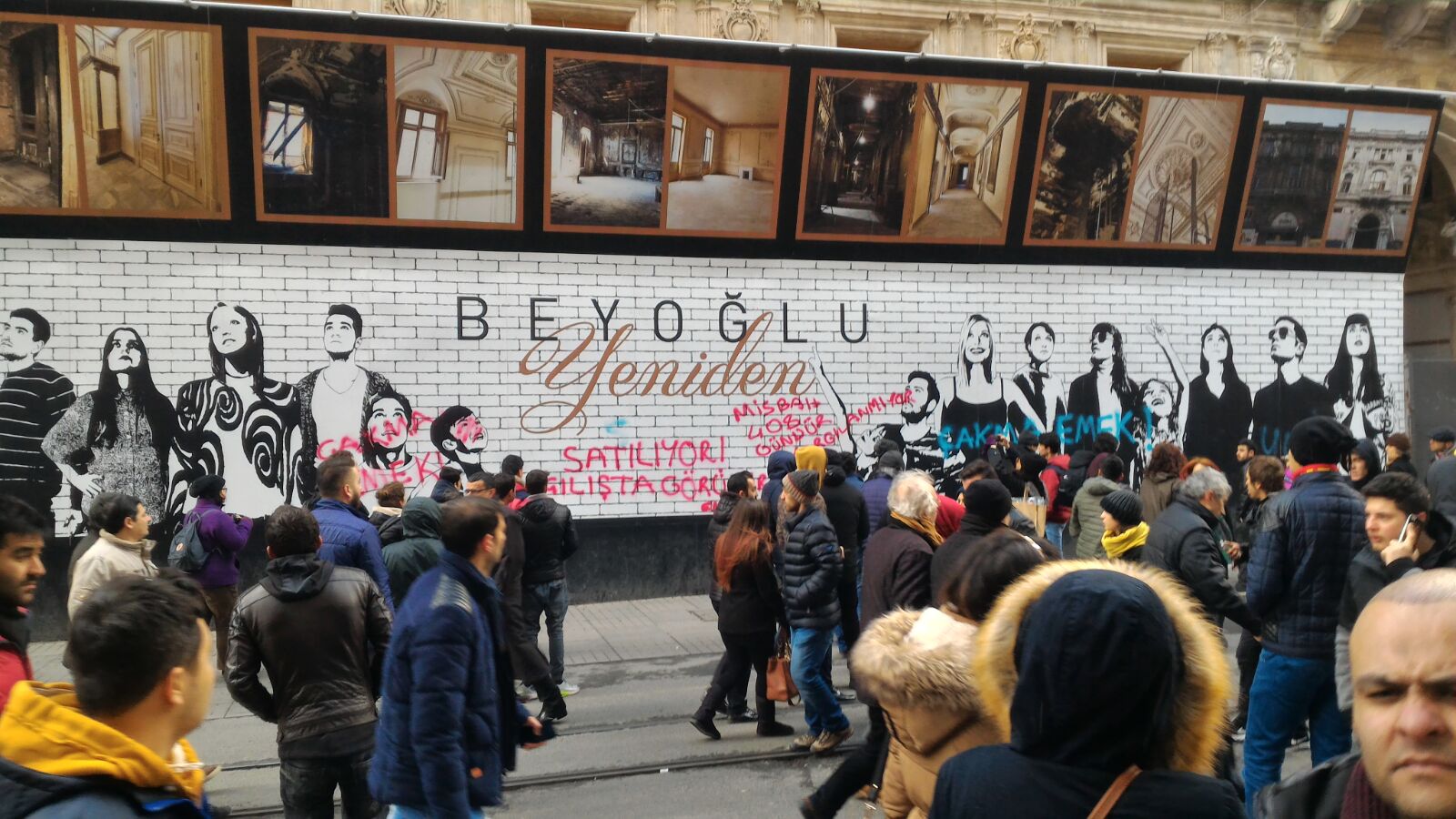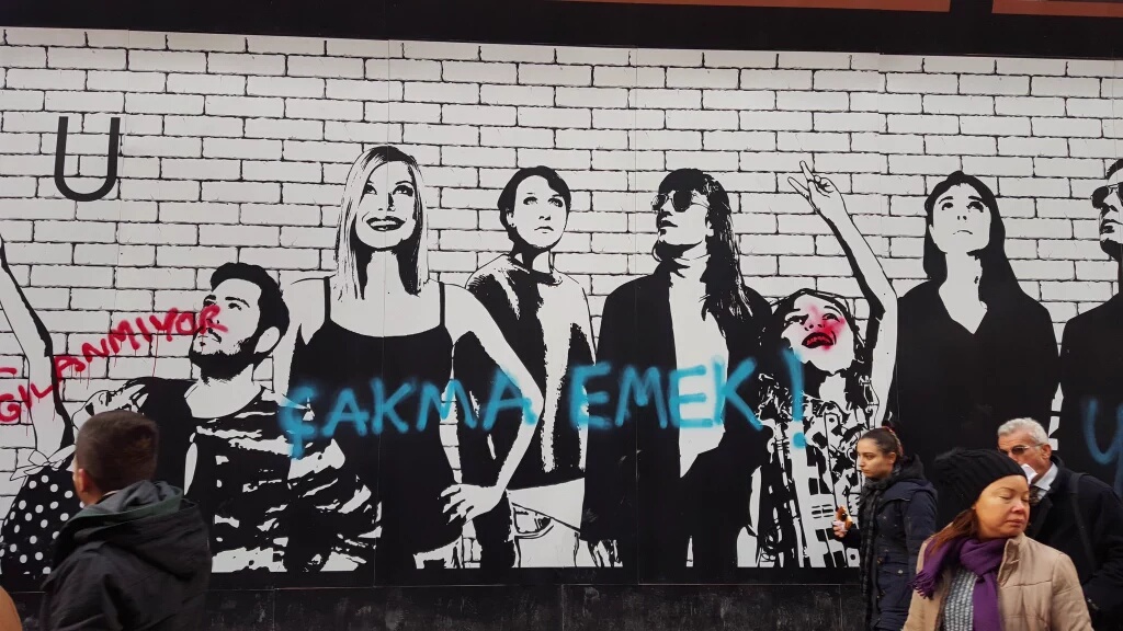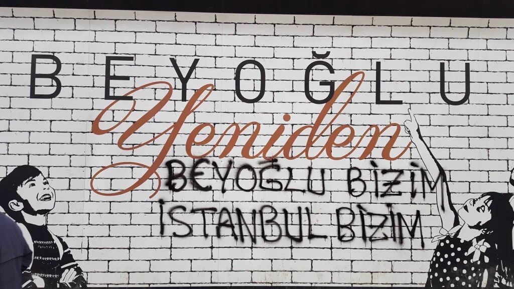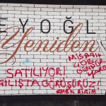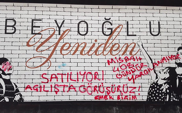 Beyoğlu Belediyesi ve AKP’nin reklamlar, köşe yazarları, ön gösterimlerle allayıp pulladığı Emek Sineması’nın da içerisinde bulunduğu AVM inşaatına “Emek bizim İstanbul bizim” diyenler yazılama yaptı. İnşaatın duvarına “Çakma Emek”, “Açılışta görüşürüz” ve “Ahmet Misbah 408 gündür yargılanmıyor” yazan yaşam savunucuları Beyoğlu Belediye Başkanı Ahmet Misbah Demircan ve AKP’nin reklam oyunlarını bozmak için bir adım attı.