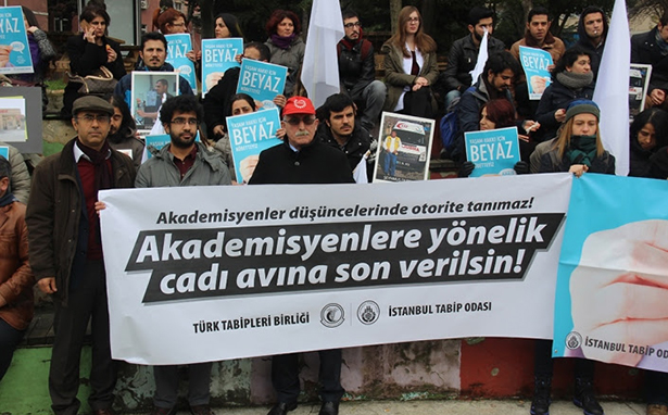 Her gün, 12.00-13.00 saatleri arasında, İstanbul Tıp Fakültesi Monoblok önünde Yaşam Hakkı İçin Beyaz Nöbet tutan sağlık çalışanlarI, Barış İçin Akademisyenler’in “Bu Suça Ortak Olmayacağız” başlıklı bildirisi nedeniyle başlatılan başlatılan baskı, soruşturma ve gözaltıları kınadı. Akademisyenlere destek açıkladı.