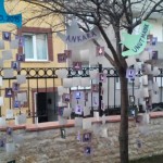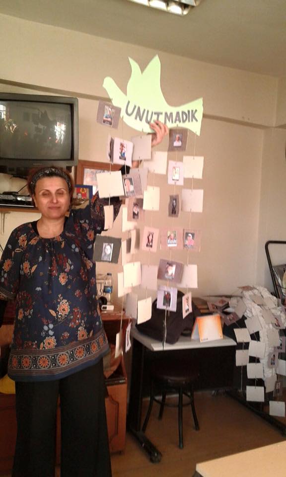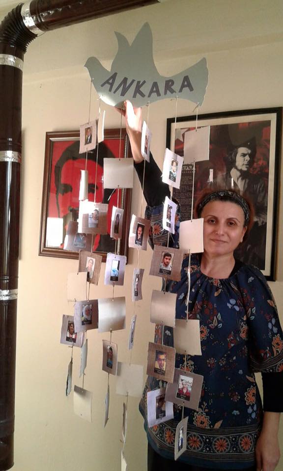Halkevci Kadınlar katliamda hayatını kaybedenlerin resimlerinin yer aldığı barış güvercinlerini parka astı.