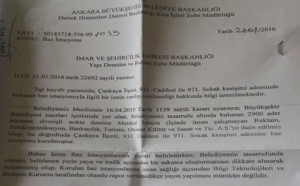 Belediye tarafından gönderilen yazıda “Büyükşehir Belediye sınırları içerisinde yer alan, Belediyemiz tasarrufu altında bulunan 2900 adet hizmete elverişli nokta üzerine, bu doğrultuda Çankaya İlçesi 931. Caddesi ile 971. Sokak kesişimine baz istasyonu kurulmuştur” denildi.