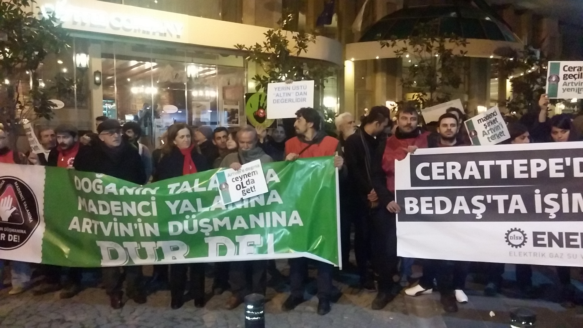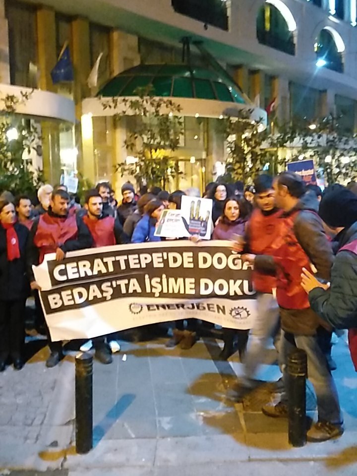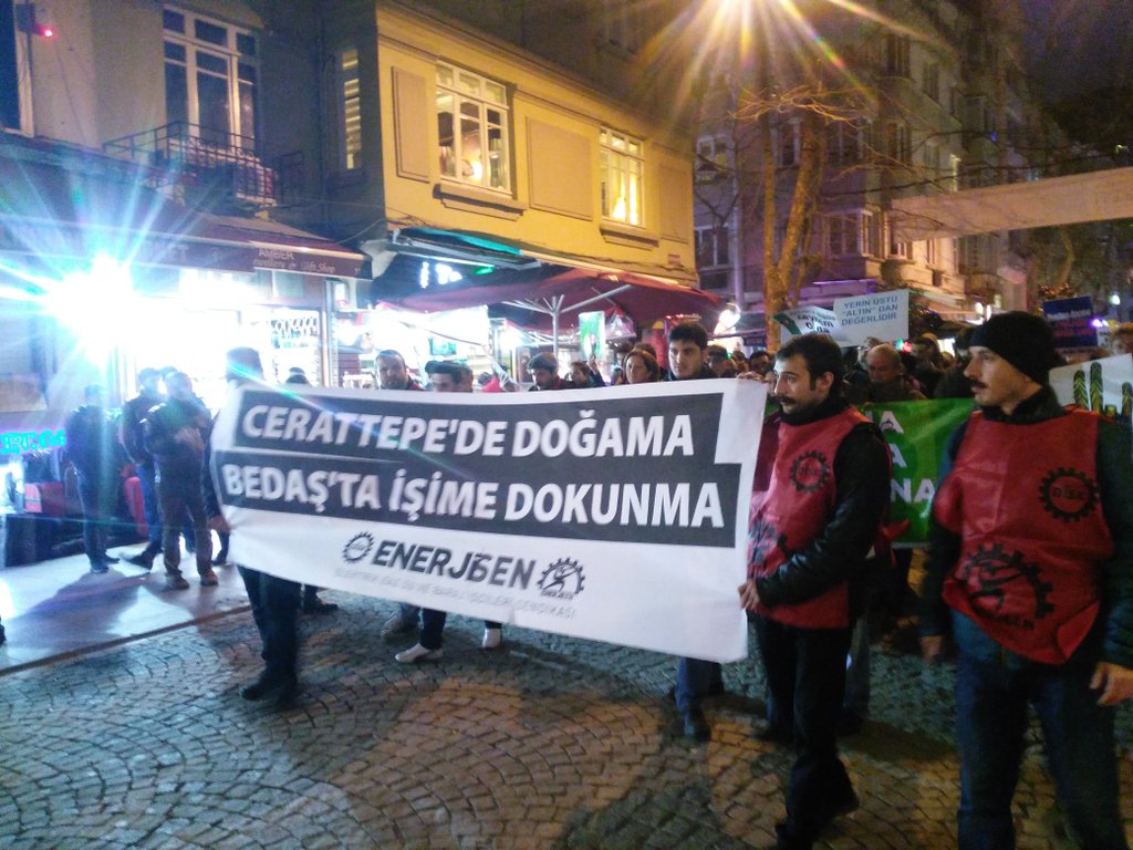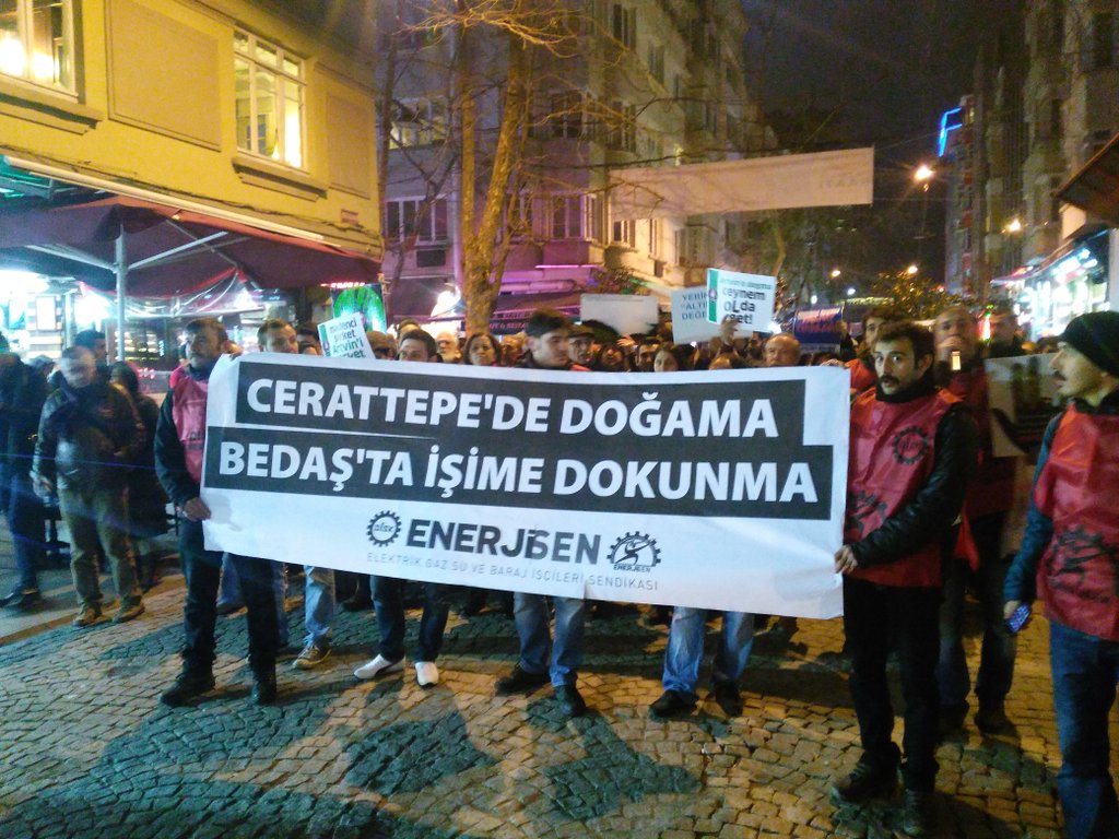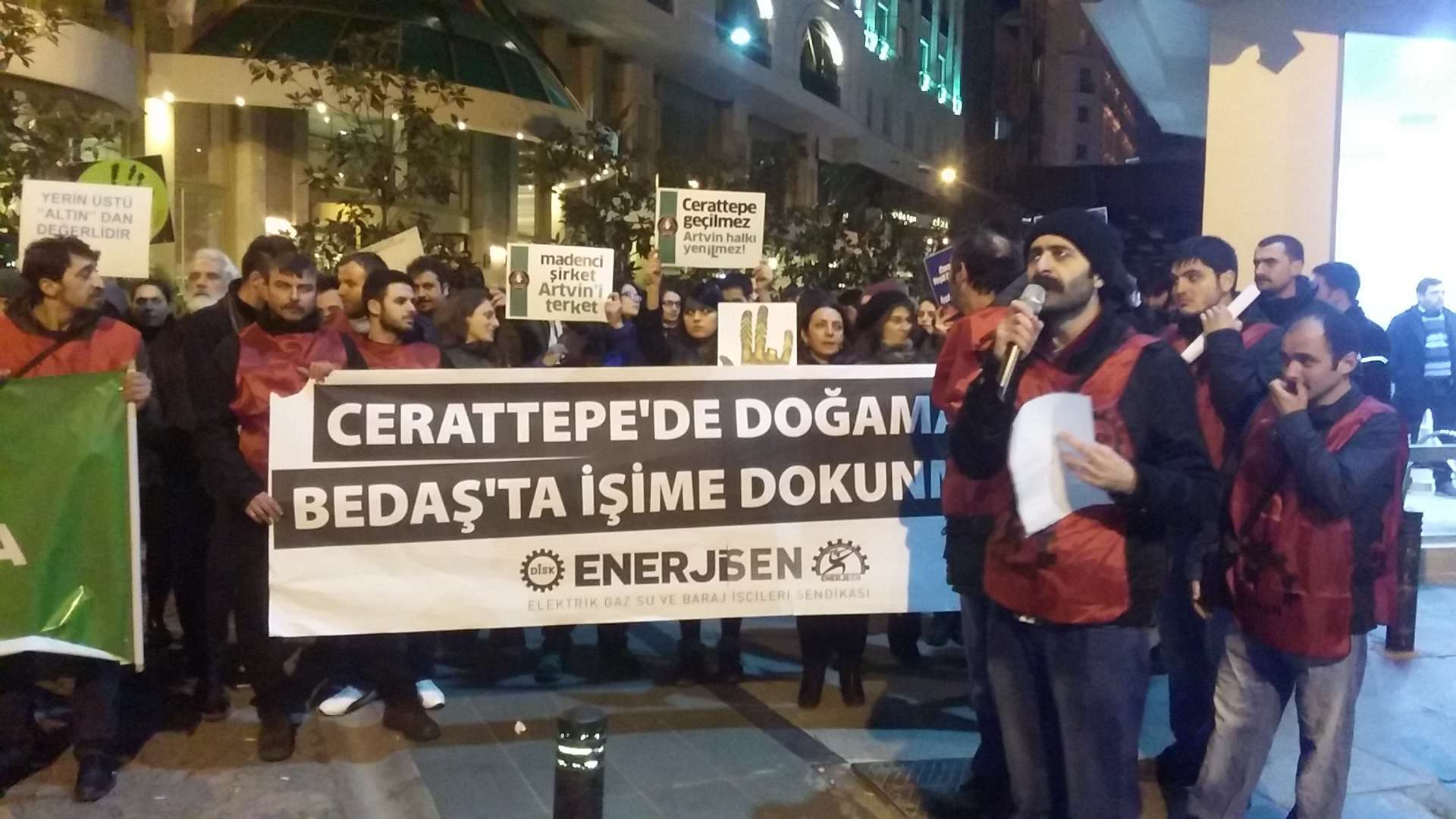 Enerji işçilerinin çağrısıyla bir araya gelenler Artvin Cerattepe’de halka rağmen yapılmak istenen madene ve işten çıkarmalara karşı 18 Şubat’ta BEDAŞ önüne yürüdü. Yürüyüş boyunca Artvin’de direnenlere seslenen işçiler “Diren Artvin işçiler seninle”, “Siyanürcü şirket Artvin’i terket” sloganları attı. İşçiler adına ilk konuşmayı yapan Enerji-Sen Genel Sekreteri Süleyman Keskin Cengiz Holding’e seslenerek “İşçilerin hakkını yok sayan, işten atan Mehmet Cengiz’ e sesleniyoruz. Artvin’i hemen terkedin” dedi.