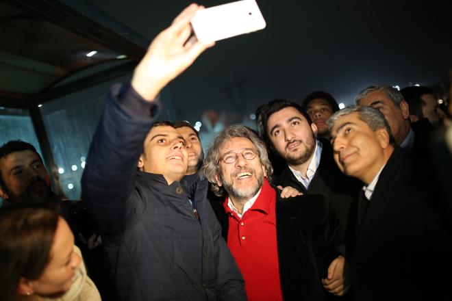 Cezaevi çıkışında konuşma yapan Can Dündar, kendilerini serbest bırakanların gece 3’e kadar beklemelerinin sebebinin Erdoğan’a doğum günü hediyesi vermek istediklerini söyledi. AYM’nin kararının Saray’a tabi olmayan bir medya ve Saray’a tabi olmayan bir yargı için atılmış bir adım olduğunu belirten Dündar, Türkiye’de gazetecilerin gerçekleri yayımlayabilmek adına ödedikleri bedel yanında kendilerininkinin bir hiç olduğunu ifade etti. Yanlarında olan herkese teşekkür eden Dündar, “Çok umutlu olarak çıkıyoruz buradan. Hiç yalnız kalmadık, yılmadık, susmadık. Yazmamamızı istediler, yazdık. Yaptığımız haberle Türkiye’nin bataklığa sürüklendiğini öne çekmeye çalıştık. Cumhurbaşkanının El Nusra ile söyledikleri haberimizin kanıtlarını gösterdi” dedi.