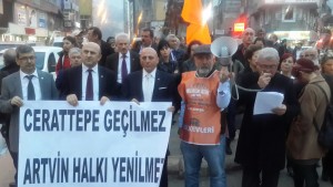 Bursa’da akşam saatlerinde Heykel Meydanı’nda Artvin’de Madene Hayır Bursa Platformu’nun çağrısıyla bir araya gelenler, Cerattepe halkının yanında olduğunu haykırdı. Eyleme emek ve demokrasi güçleri ile Bursa CHP Milletvekili Orhan Sarıbal da katıldı. Konuşma yapan Orhan Sarıbal, Cerattepe’deki direniş nöbetine 3 ay önce katıldığını belirterek, “Aradan 3 ay geçti, ama Artvinli dostlar orada bütün güçleri ile mücadele ediyorlar. Aslında mesele belli, mesele kar ve rant uğruna bu ülkenin dağları, ormanları, dereleri talan ediliyor. Yani mesele emperyalizmin yerli işbirlilçilerinin çıkarıysa, ki bunun en başında Kaçak Saray’daki adam gelmektedir. Onun altında kumandalı başbakanı ve bu ülkenin sermayesini bölüşen işbirlikçi işverenleri, işbirlikçi yamyamları, işbirlikçi barbarları gelmektedir” dedi.