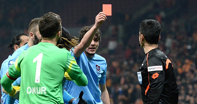 Trabzonsporlu futbolcunun, birden fazla oyuncunun teması sonucu hakemin elinden ya da cebinden yere düşürmek durumunda kaldığı kırmızı kartı yerden alıp hakeme göstermesi elbette egzantrik ve tekil bir olaydı. Çünkü şimdiye dek belki de sahalarda hiç yaşanmamıştı.