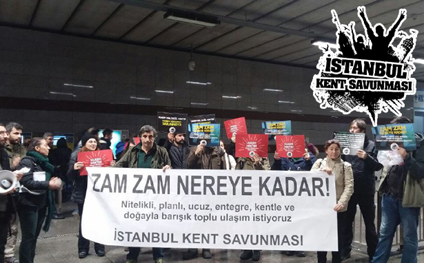 İstanbul’da ulaşıma yapılan zamlara karşı bir eylem de İstanbul Kent Savunması’ndan (İKS) geldi. Mecidiyeköy metrobüs durağında bir araya gelen İKS’liler, “Ulaşım mal değil haktır, ulaşım hakkını savunmaya” diyerek duraktaki yurttaşlara çağrı yaptı, daha sonra ise nitelikli, ucuz, entegre, kentle ve doğayla barışık toplu ulaşım istediklerini ifade ederek turnikelerden atladı.