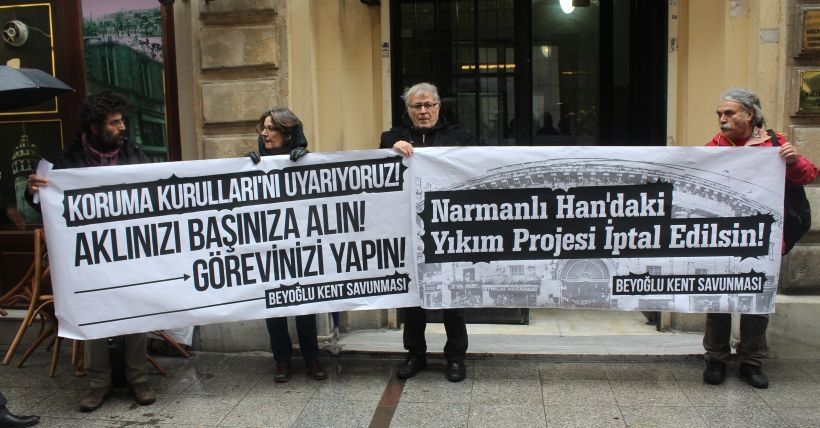 Beyoğlu Kent Savunması, Narmanlı Han için Koruma Kurulu önünde eylem yaptı. Kent Savunması üyeleri, projenin, hanın tarihi dokusuna zarar vereceğini ifade ederek durdurulmasını talep etti