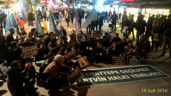 İzmir’de “Cerattepe geçilmez, Artvin halkı yenilmez” diyerek Sevinç Pastanesi önünde oturma yapanlara polis saldırdı. 17 kişi gözaltına alındı. yaya yolunun “trafiğe kapatılması” gerekçesiyle polis müdahale etti. Gözaltına alınanların isimleri: Yüksel Keleş, Sanem Deniz Kural, Murat Aydın, Anıl Meclis, Orhan Aksakal, Doğan Barış, Nuri İşbilir, Ezgi Bahçeci, Nazım Bahçeci, Deniz Bakır, Uğur Göçmüş, Nizamettin Yılmaz, Ozan Karaçanta, Ozan Can Özgür, Yalçın Kaptan.