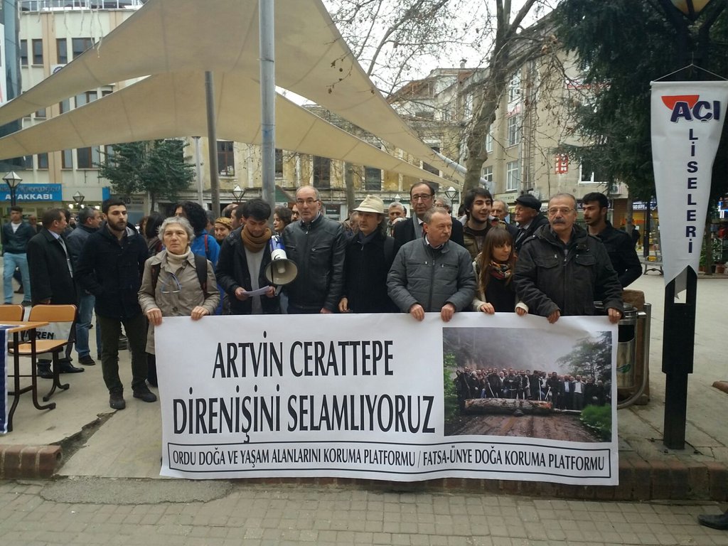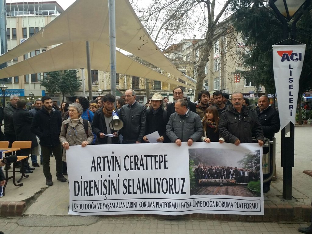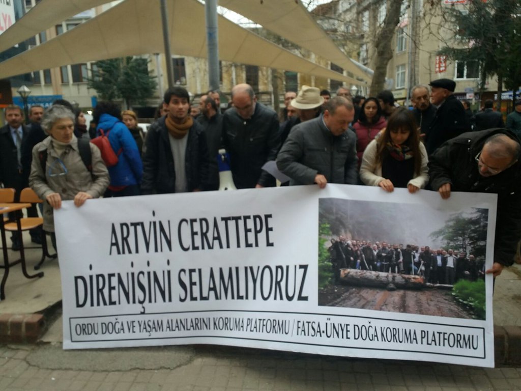 Ordu Doğa ve Yaşam Alanlarını Koruma Platformu ile Fatsa-Ünye Doğa Koruma Platformu, Tahıl Pazarı mevkisinde basın açıklaması düzenledi. Açıklamada “Karadeniz’in doğal varlıklarına göz dikenler buradaki yaşamı, doğal ve kültürel mirası hiçe sayıyorlar. Ortak ya da özel yaşam alanları savaş sırasında uygulanan yasalarla acele kamulaştırılıp özel şirketlerin hizmetine sunuluyor. Hiç birinde kamu yararı olmayan projeler, ülkemizin bütçesine katkı yalanıyla uygulanmaya başlıyor. Artvin’de yaşananlar ilimizde de yıllardır yaşanıyor. Üzerinde HES projesi olmayan hiçbir deremiz kalmadı. Fatsa’daki altın madeni alanında artık siyanür kullanılmaya başlandı. Birinci sırada geçim kaynağımız olan fındık bahçeleri HES’ler, maden ve taş ocakları nedeniyle hızlı bir şekilde yok oluyor. Ormanlarımız kayalık alanlara dönüştü. Toprağımıza, suyumuza sahip çıkmanın tek yolu birlikte olmaktan geçiyor. Bunu Artvin başarıyor, Artvin’in davası bizimde davamızdır” denildi.