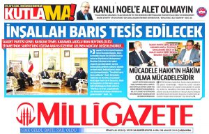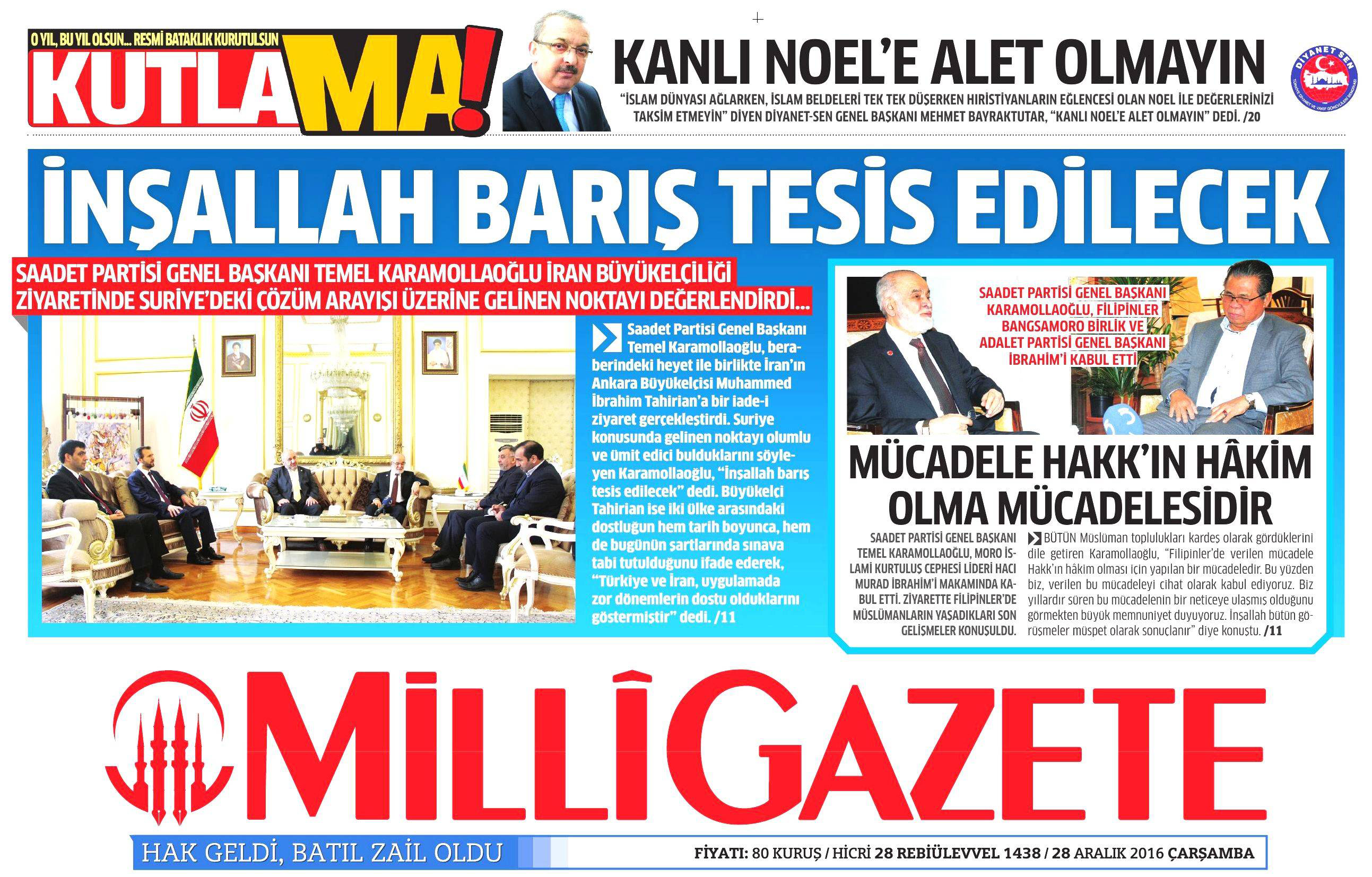 Milli Görüş geleneğinin gazetesi Milli Gazete, yılbaşı kutlamalarından günler öncesinde “Kutlama!” başlıklı bir kampanya başlattı. Kampanya ilk olarak gazetenin 26 Aralık günkü manşetinde yer aldı. Bir “gönüllülük kampanyası”na öncülük ettiğini ileri süren gazetenin manşetinde “Maneviyatımıza yerleştirilen Yılbaşı bombasını kontrollü bir şekilde patlatalım” ifadeleri yer aldı.