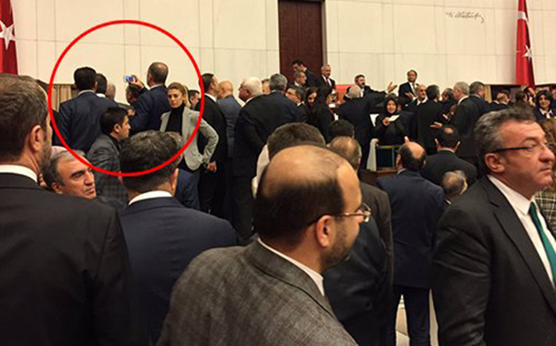 Tuncay Özkan arkasını döndüğünde AKP’li milletvekili gördü. Ve kendisini de AKP’li zanneden milletvekilini göstererek bağırmaya başladı: