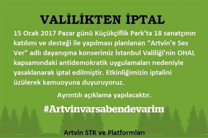 Artvin STK ve Platformları tarafından yapılan açıklamada “Pazar günü Küçükçiftlik park’ta 18 sanatçının katılımı ve desteğiyle yapılması planlanan “Artvin’e Ses Ver” adlı dayanışma konserimiz, İstanbul Valiliği’nin OHAL kapsamındaki keyfi ve anti demokratik uygulamaları nedeniyle yasaklanarak iptal edilmiştir. Etkinliğimizin iptalini üzülerek kamuoyu ile paylaşıyoruz” denildi.