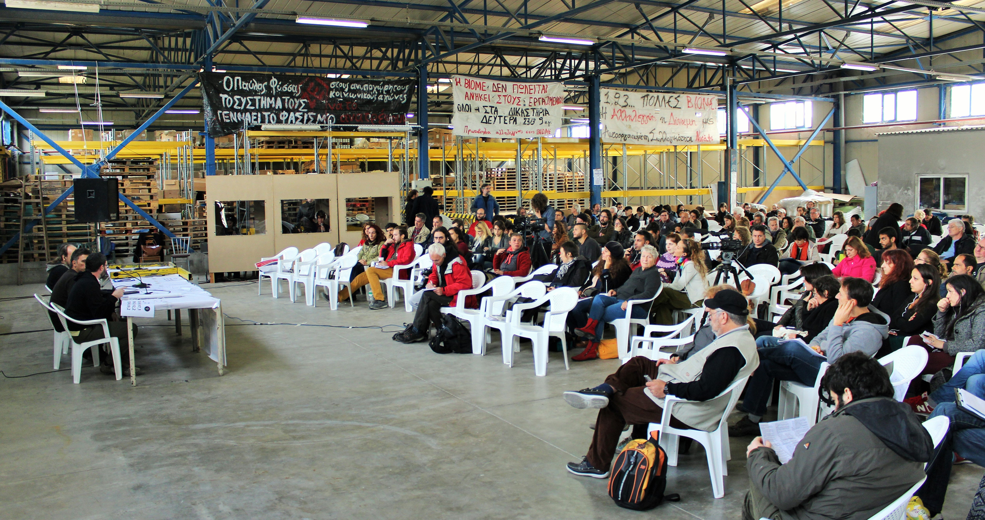 İlk bakışta bu bir fabrika: Ağır makineler, kasalar, paletler, endüstriyel variller ve el emeği ile çalışan erkekler. Belki de, depo etrafında asılı ev yapımı pankartlar dışında çok az şey göze batıyor. Onlar da Yunanca, yani onları okumak mümkün olmayabilir, ama bunların IKEA endüstriyel şıklık kataloğundan stok dekorasyon ürünleri olmadığı aşikâr.