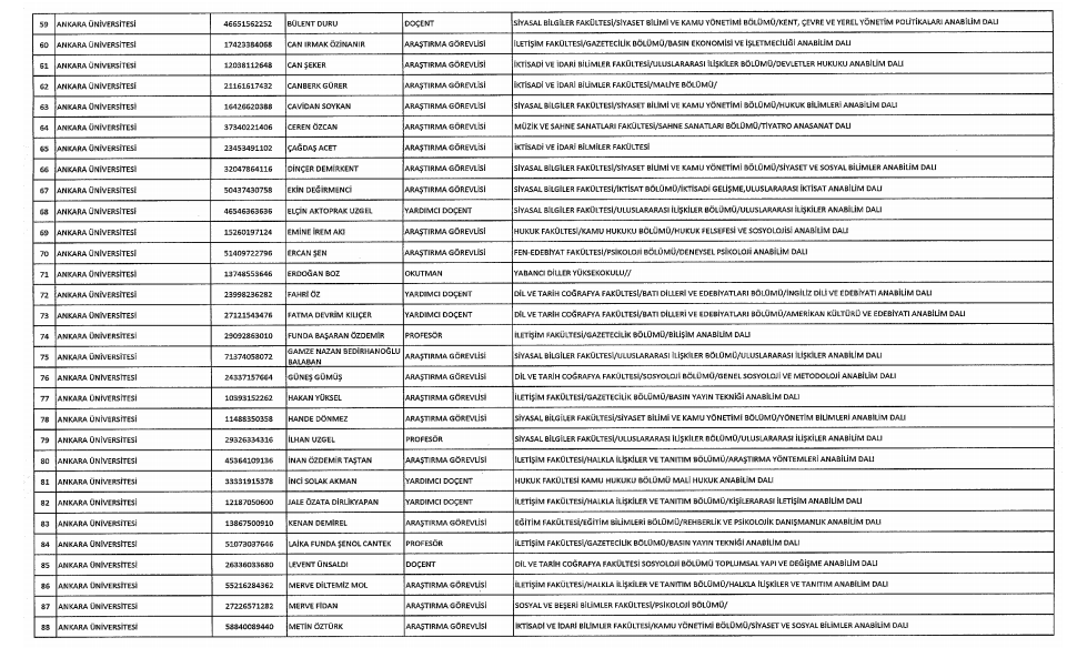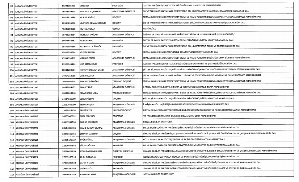 Üniversitelerin bazı fakültelerinde neredeyse akademisyen kalmadı. Ankara Üniversitesi Siyasal Bilgiler Fakültesi’nden 20, İletişim Fakültesi’nden 16 akademisyen ihraç edildi. Geçtiğimiz haftalarda görevinden istifa eden akademisyenler Levent Ünsaldı ve Mine Gencel Bek de ihraçlar arasında.