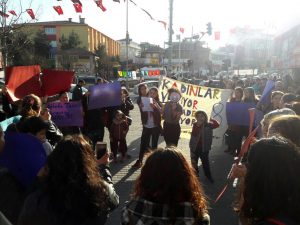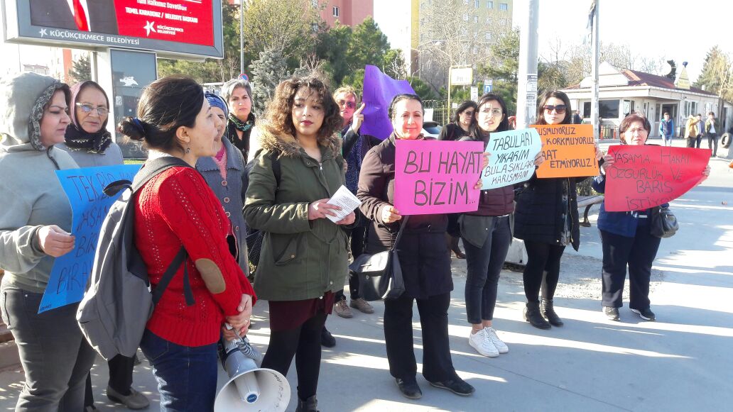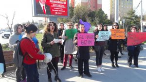 İkitelli ve Atakent’ten kadınlar, Arena Park önünde buluşarak 5 Mart Pazar günü Bakırköy’de yapılacak mitinge katılım çağrısı yaptılar. “Bu hayat bizim”, “Tabuları yıkarım, bulaşıklara karışmam”, “Susmuyoruz, korkmuyoruz, itaat etmiyoruz”, “Kimsenin namusu olmayacağız” yazılı dövizlerin taşındığı eylemde “Yaşasın 8 Mart, yaşasın kadın dayanışması” sloganları atıldı.