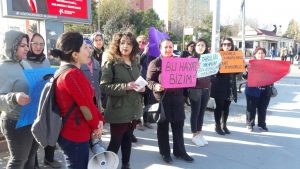Eylemde okunan açıklamada tüm kadınlara seslenilerek, “8 Mart’a giderken size çağrımız, gelin beraberce birbirimize dair şüphelerimizi askıya alalım ve konuşalım. Evlerde, iş yerlerinde, okullarda, çarşıda, pazarda, parkta, otobüs yolculuğunda, ekmek sırasında gelin kadınlar olarak birle nasıl bir gelecek istediğimiz, hep birlikte konuşup, hep birlikte dile getirebildiğimiz, korkuyu neşeye, düşmanlığı değil ortaklığı, kaygıyı değil umudu paylaşalım 5 Mart’ta Bakırköy Özgürlük Meydanı’nda yapacağımız mitinge davet ediyoruz” denildi.