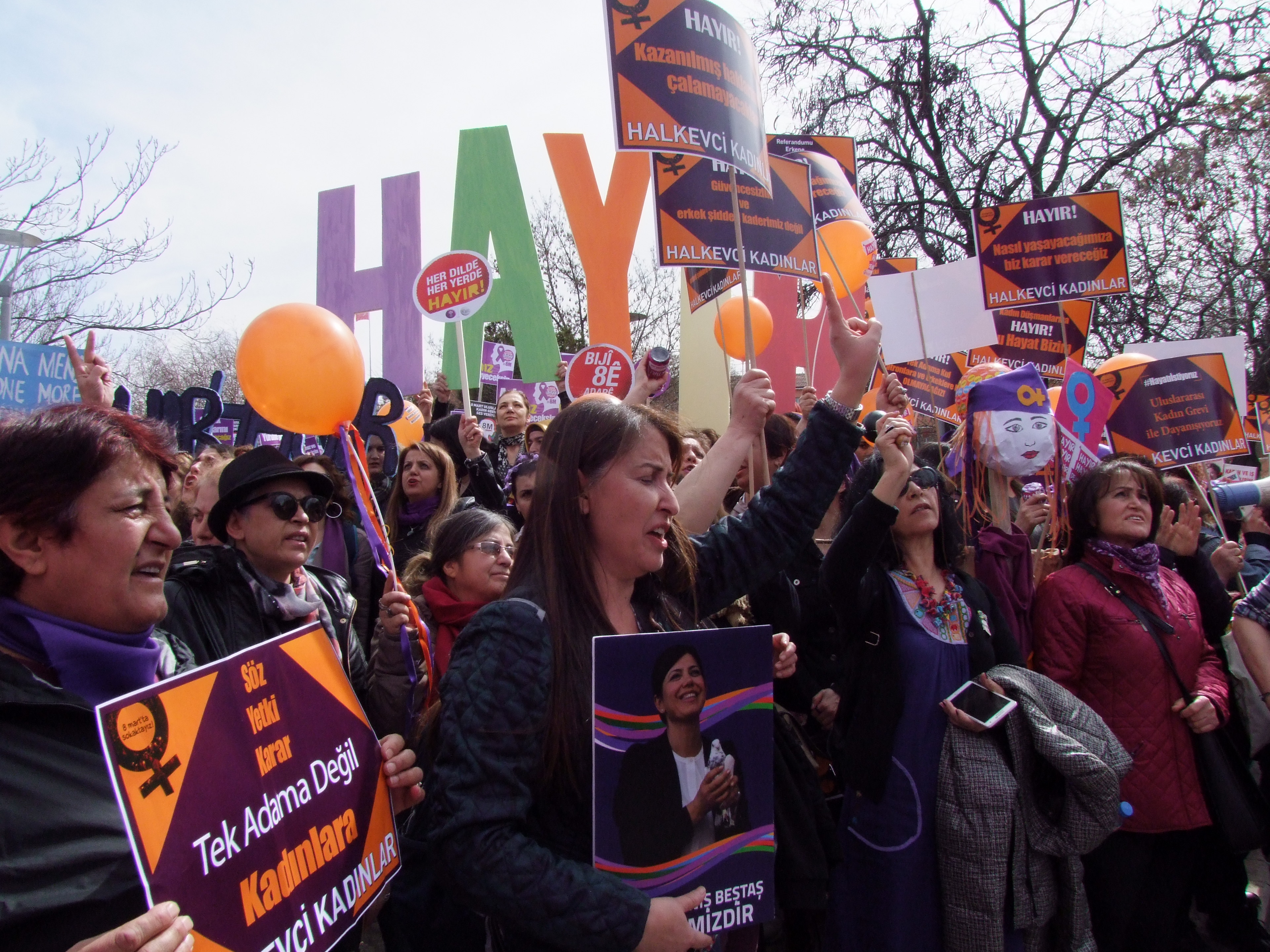 Ankara’da kadınlar renk renk “Hayır”ları ve Tek Adam’a karşı sözleriyle 8 Mart mitinginde buluştu. Miting sonunda yürüyüş yapan kadınlara ise polisler engel olamadı
