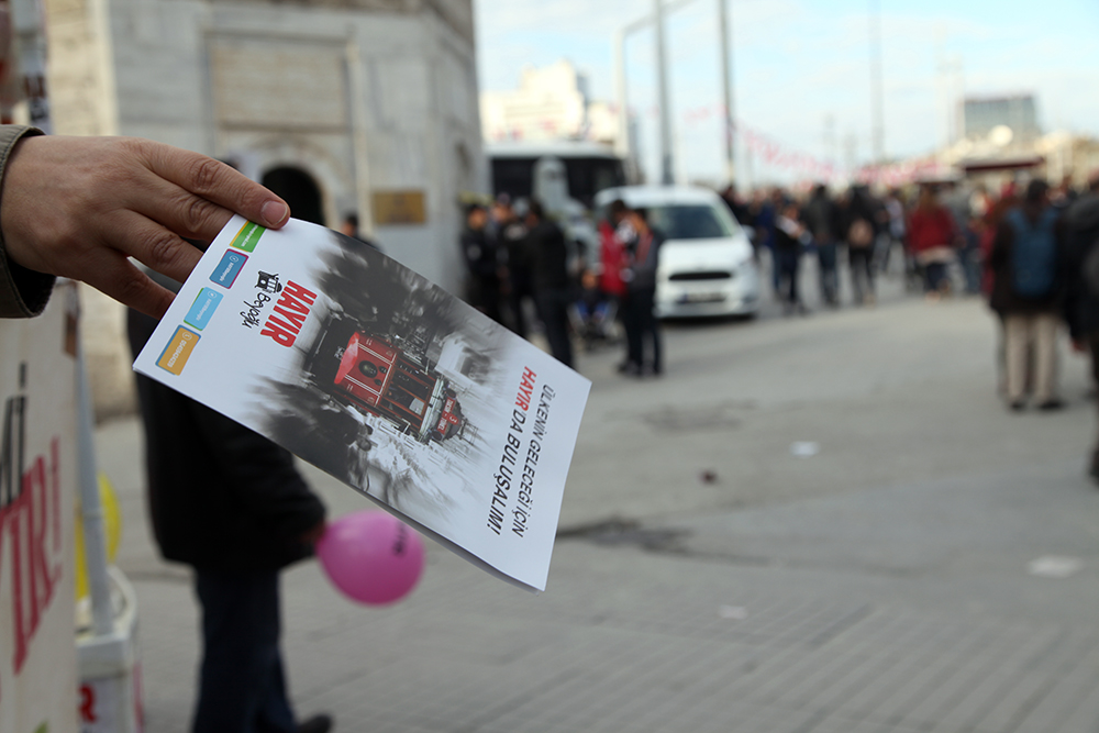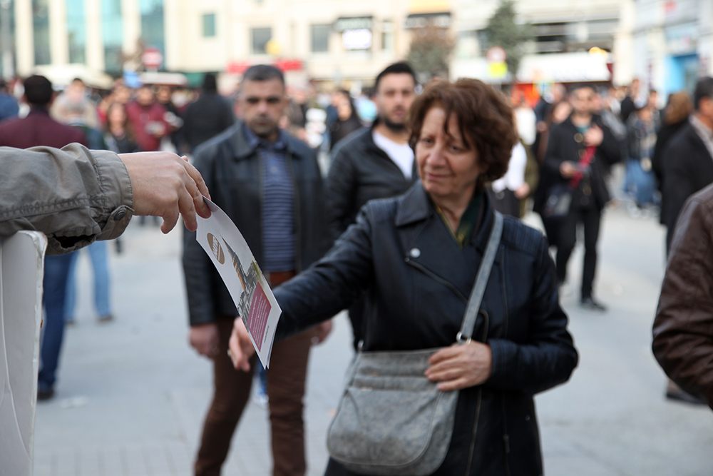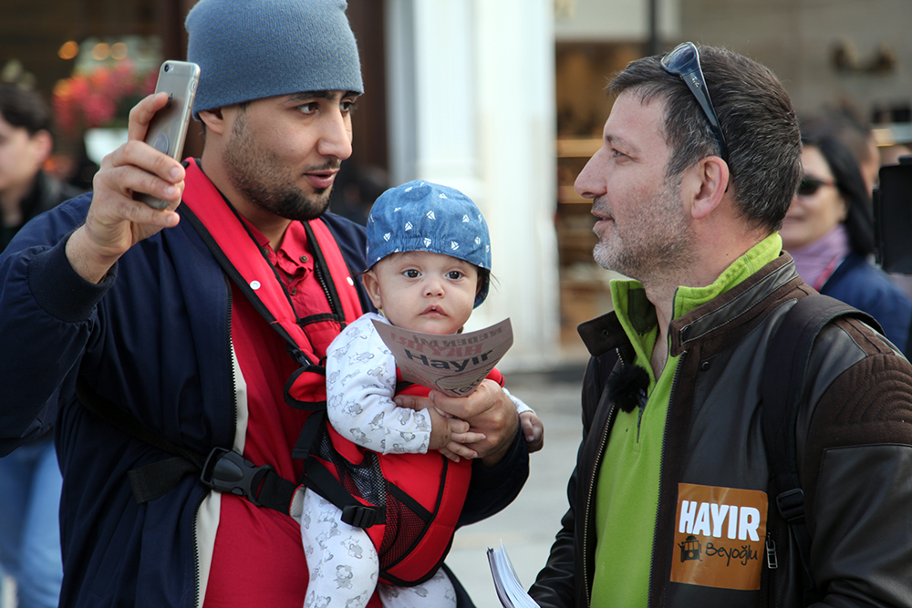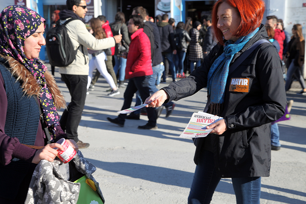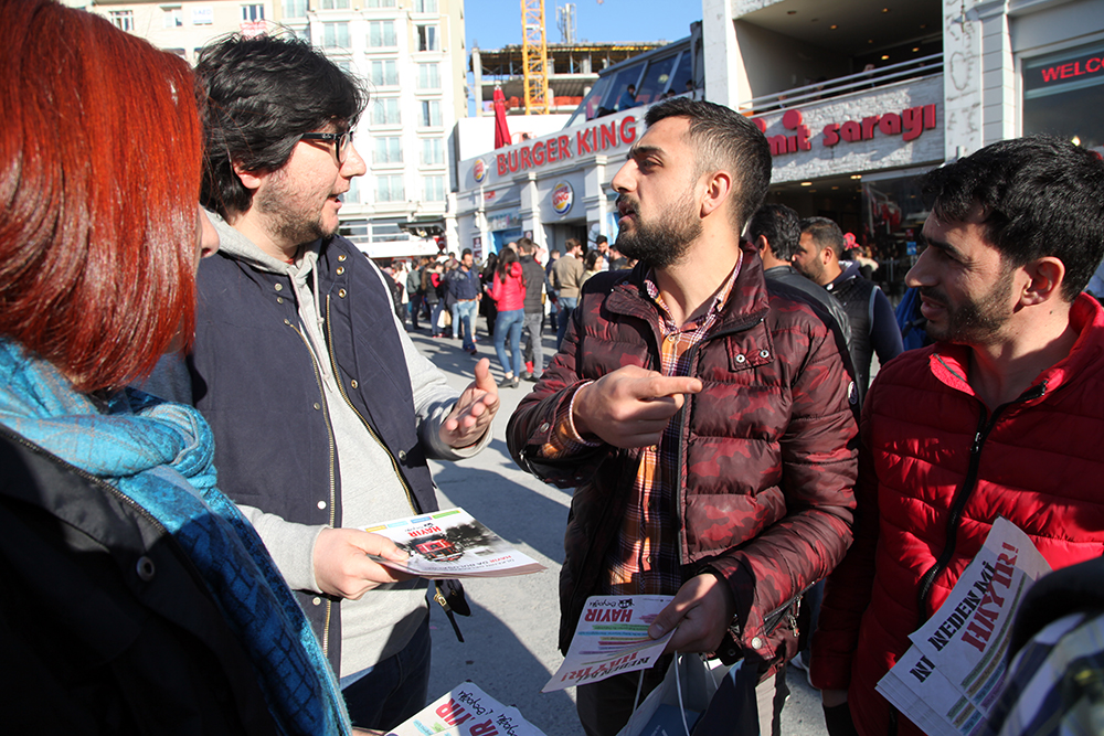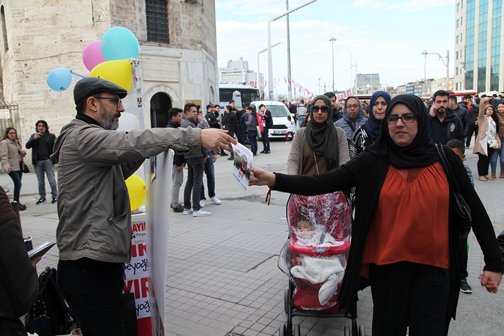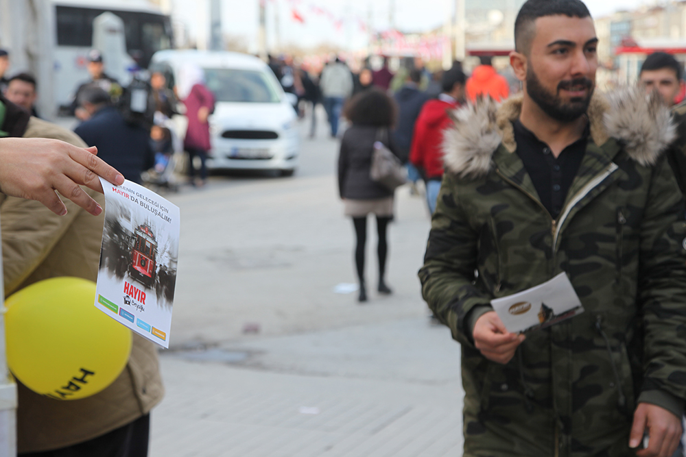 “Ülkenin geleceği için “hayır”da buluşalım” diyen Hayır Beyoğlu Meclisi İstiklal Caddesi’nde “hayır” yürüyüşü gerçekleştirdi. Her gün olduğu gibi bugün de İstiklal Caddesi’nin başına “hayır” standını kuran meclis üyeleri gün boyunda bildiri dağıttı, “hayır”ı anlattı.